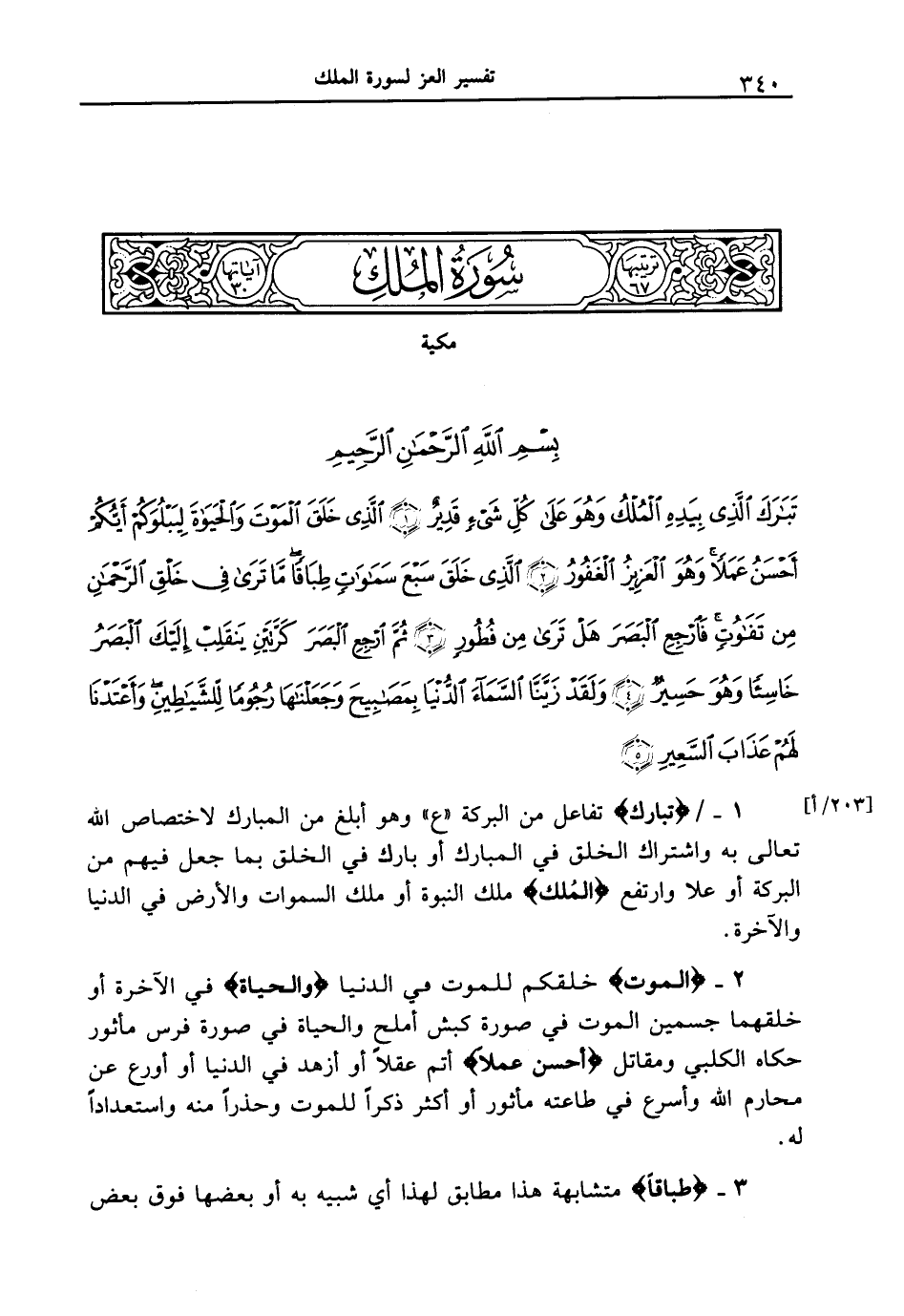 1 -[203 / أ] / {تَبَارَكَ} تفاعل من البركة " ع " وهو أبلغ من المبارك لاختصاص الله تعالى به واشتراك الخلق في المبارك أو بارك في الخلق بما جعل فيهم من البركة أو علا وارتفع {الْمُلْكُ} ملك النبوة أو ملك السموات والأرض في الدنيا والآخرة.