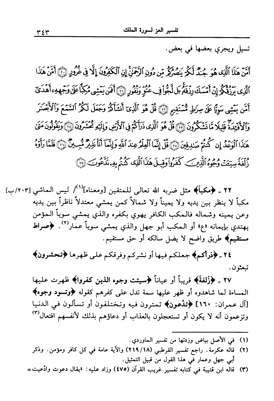 22 - {مُكِبّاً} مثل ضربه الله تعالى للمتقين [ومعناه] [203 / ب] / ليس الماشي مكباً لا ينظر بين يديه ولا يميناً ولا شمالاً كمن يمشي معتدلاً ناظراً بين يديه وعن يمينه وشماله فالمكب الكافر يهوي بكفره والذي يمشي سوياً المؤمن يهتدي بإيمانه " ع " أو المكب أبو جهل والذي يمشي سوياً عمار. {صِرَاطٍ مُّسْتَقِيمٍ} طريق واضح لا يضل سالكه أو حق مستقيم.