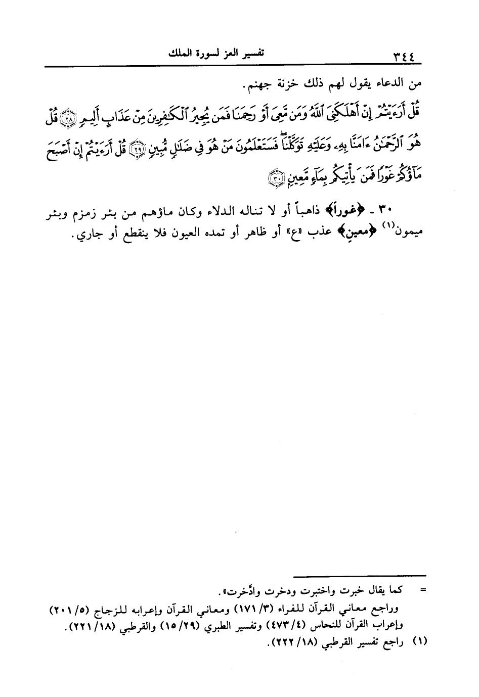 30 - {غَوْراً} ذاهباً أو لا تناله الدلاء وكان ماؤهم من بئر زمزم وبئر ميمون {مَّعِينٍ} عذب " ع " أو ظاهر أو تمده العيون فلا ينقطع أو جاري.