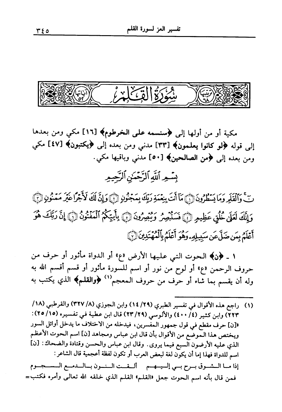 1 - {ن} الحوت التي عليها الأرض " ع " أو الدواة مأثور أو حرف من حروف الرحمن " ع " أو لوح من نور أو اسم للسورة مأثور أو قسم أقسم الله به وله أن يقسم بما شاء أو حرف من حروف المعجم {وَالْقَلَمِ} الذي يكتب به