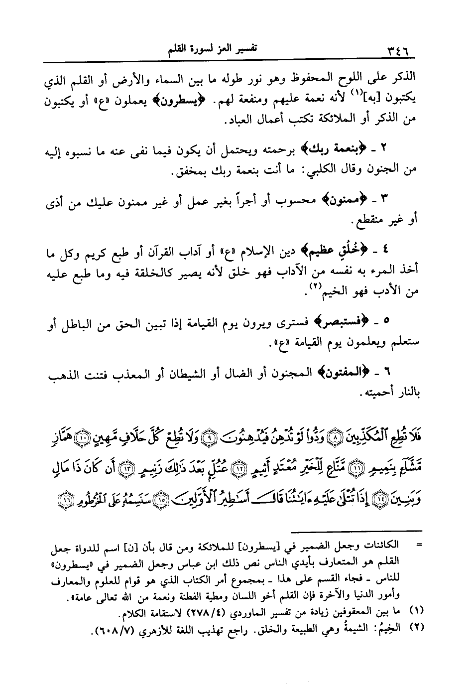 4 - {خُلُقٍ عَظِيمٍ} دين الإسلام " ع " أو آداب القرآن أو طبع كريم وكل ما أخذ المرء به نفسه من الآداب فهو خلق لأنه يصير كالخلقة فيه وما طبع عليه من الأدب فهو الخيم.