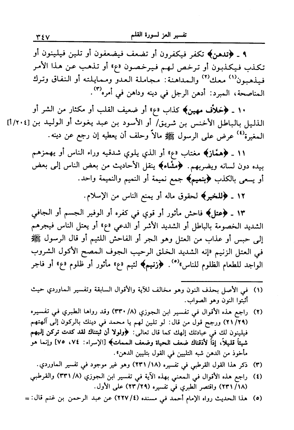 13 - {عُتُلٍّ} فاحش مأثور أو قوي في كفره أو الوفير الجسم أو الجافي الشديد الخصومة بالباطل أو الشديد الأشر أو الدعي " ع " أو يعتل الناس فيجرهم إلى حبس أو عذاب من العتل وهو الجر أو الفاحش اللئيم أو قال الرسول [صلى الله عليه وسلم] في العتل الزنيم " إنه الشديد الخلق الرحيب الجوف المصح الأكول الشروب الواجد للطعام الظلوم للناس ". {زَنِيمٍ} لئيم " ع " مأثور أو ظلوم " ع " أو فاجر