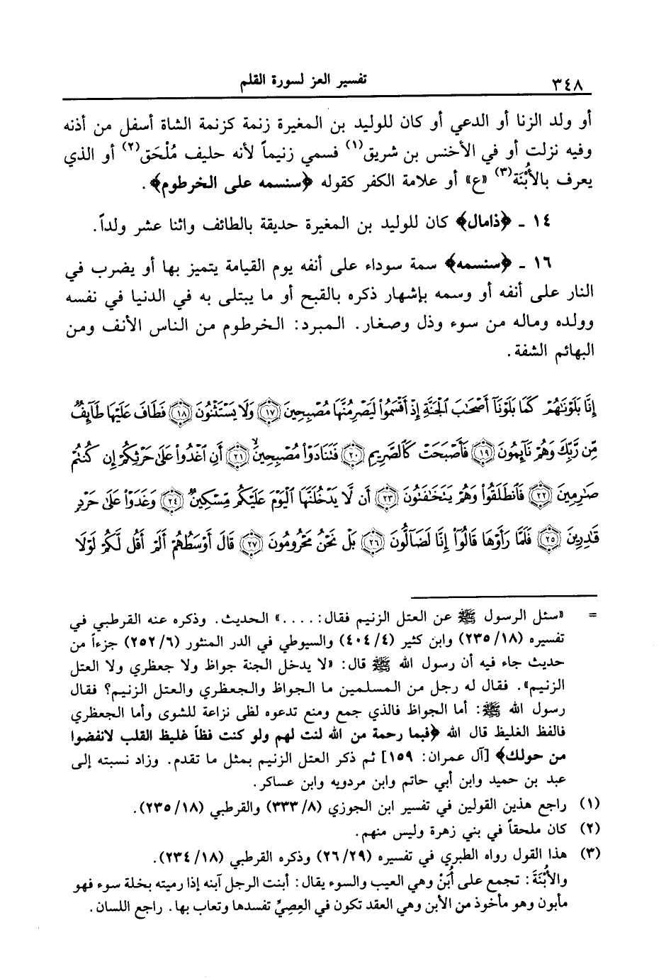 16 - {سَنَسِمُهُ} سمة سوداء على أنفه يوم القيامة يتميز بها أو يضرب في النار على أنفه أو وسمه بإشهار ذكره بالقبح أو ما يبتلى به في الدنيا في نفسه وولده وماله من سوء وذل وصغار. المبرد: الخرطوم من الناس الأنف ومن البهائم الشفة.