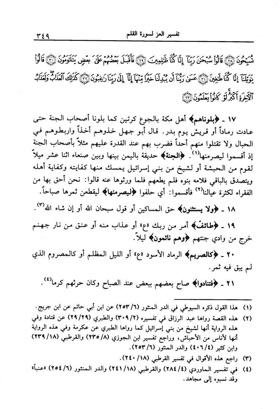 17 - {بَلَوْنَاهُمْ} أهل مكة بالجوع كرتين كما بلونا أصحاب الجنة حتى عادت رماداً أو قريش يوم بدر. قال أبو جهل خذوهم أخذاً واربطوهم في الحبال ولا تقتلوا منهم أحداً فضرب بهم عند القدرة عليهم مثلاً بأصحاب الجنة إذ أقسموا ليصرمنها. {الْجَنَّةِ} حديقة باليمن بينها وبين صنعاء أثنا عشر ميلاً لقوم من الحبشة أو لشيخ من بني إسرائيل يمسك منها كفايته وكفاية أهله ويتصدق بالباقي فلامه بنوه فلم يطعهم فلما ورثوها عنه قالوا: نحن أحق بها من الفقراء لكثرة عيالنا فأقسموا: أي حلفوا {لَيَصْرِمُنَّهَا} ليقطعن ثمرها صباحاً.