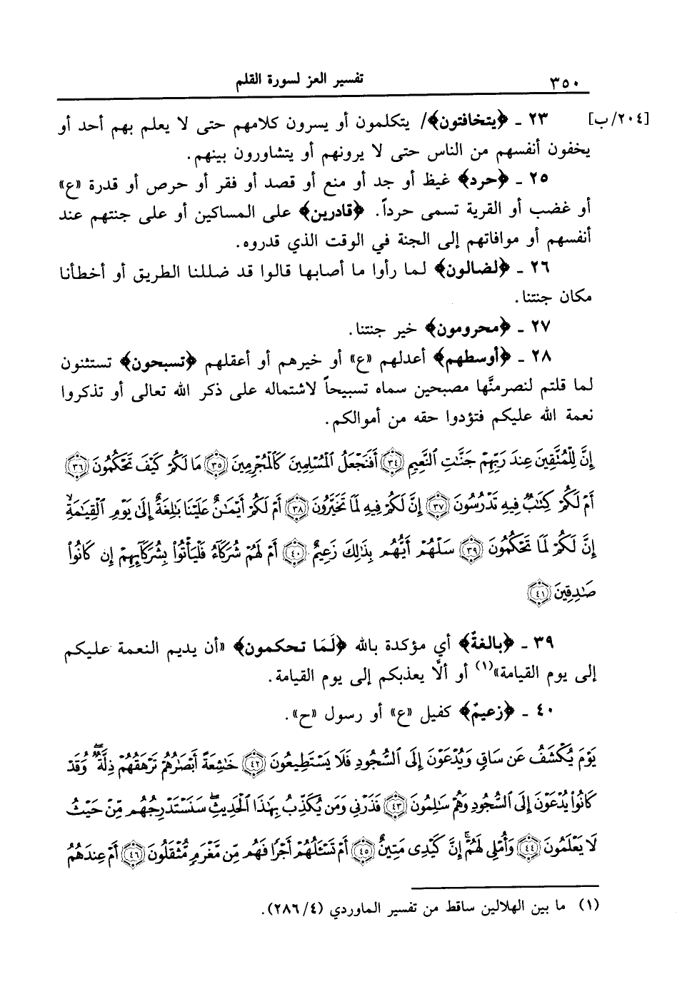 25 - {حَرْدٍ} غيظ أو جد أو منع أو قصد أو فقر أو حرص أو قدرة " ع " أو غضب أو القرية تسمى حرداً. {قَادِرِينَ} على المساكين أو على جنتهم عند أنفسهم أو موافاتهم إلى الجنة في الوقت الذي قدروه.