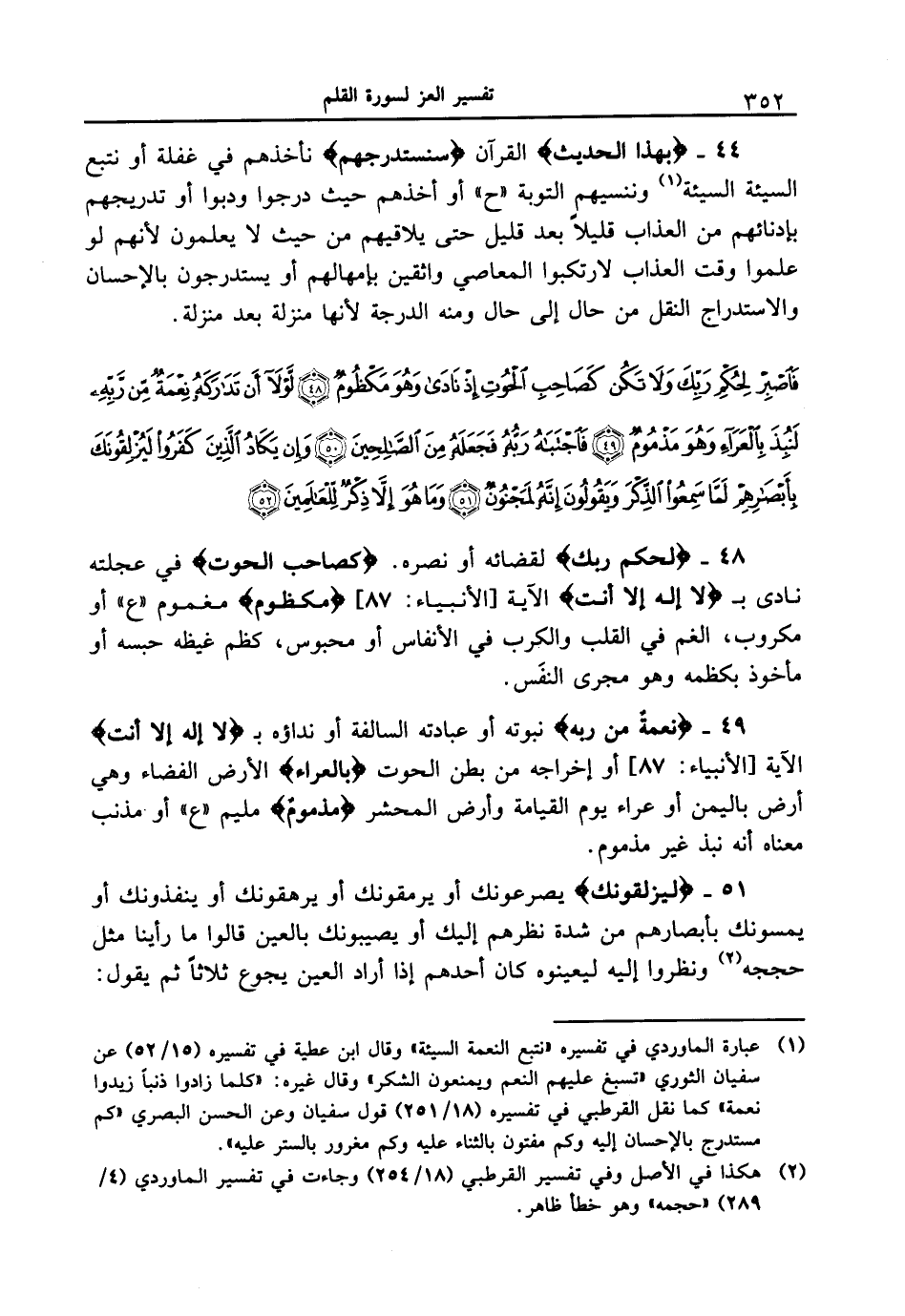 {فاصبرْ لحكمِ ربكَ ولاَ تكن كصاحبِ الحوتِ إذْ نادى وهوَ مكظومٌ (48) لولا أن تداركهُ نعمةٌ من ربهِ لنبذَ بالعراءِ وهوَ مذمومٌ (49) فاجتباهُ ربُّهُ فجعلهُ منَ الصالحينَ (50) وإن يكادُ الذينَ كفرواْ ليزلقونَكَ بأبصارهمْ لمَّا سمعواْ الذكرَ ويقولونَ إنهُ لمجنونٌ (51) ومَا هوَ إلاَّ ذكرٌ للعالمينَ (52) }