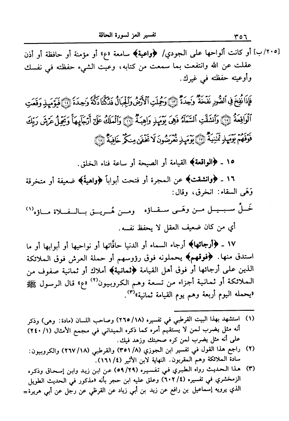 16 - {وَانشَقَّتِ} عن المجرة أو فتحت أبواباً {وَاهِيَةٌ} ضعيفة أو متخرقة وَهَي السقاء: انخرق، وقال: