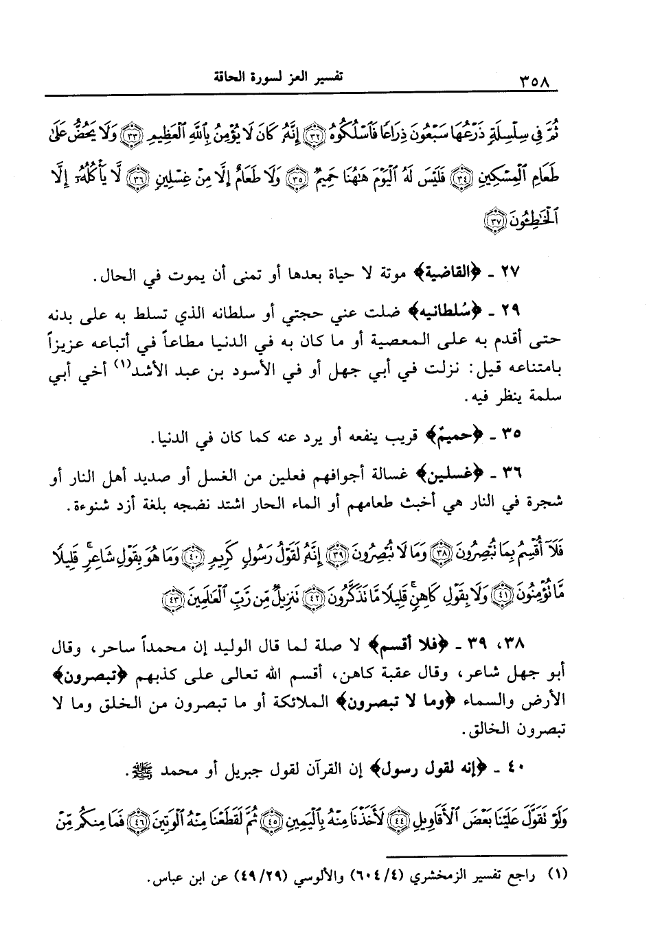 29 - {سُلطانية} ضلت عني حجتي أو سلطانه الذي تسلط به على بدنه حتى أقدم به على المعصية أو ما كان به في الدنيا مطاعاً في أتباعه عزيزاً بامتناعه قيل: نزلت في أبي جهل أو في الأسود بن عبد الأشد أخي أبي سلمة ينظر فيه.