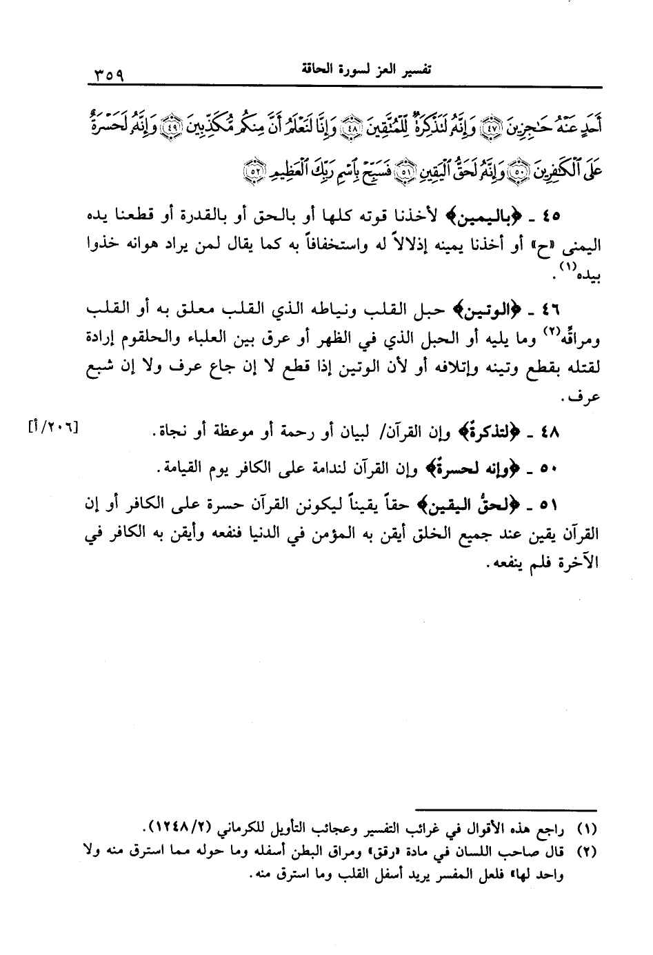 46 - {الْوَتِينَ} حبل القلب ونياطه الذي القلب معلق به أو القلب ومراقِّه وما يليه أو الحبل الذي في الظهر أو عرق بين العباء والحلقوم إرادة لقتله بقطع وتينه وإتلافه أو لأن الوتين إذا قطع لا إن جاع عرف ولا إن شبع عرف.