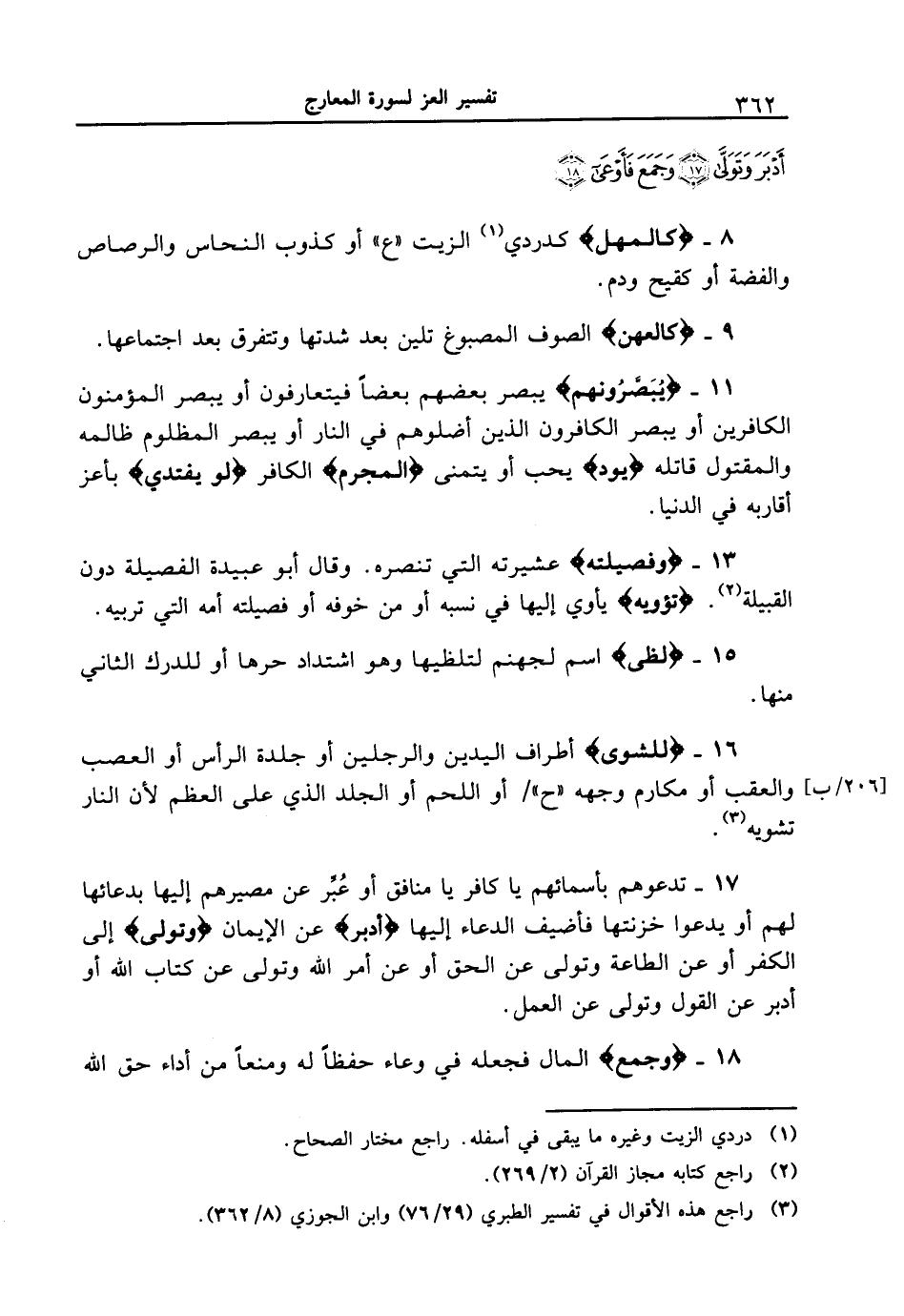 16 - {لِّلشَّوَى} أطراف اليدين والرجلين أو جلدة الرأس أو العصب والعقب أو مكارم وجهه " ح " [206 / ب] / أو اللحم أو الجلد الذي على العظم لأن النار تشويه.