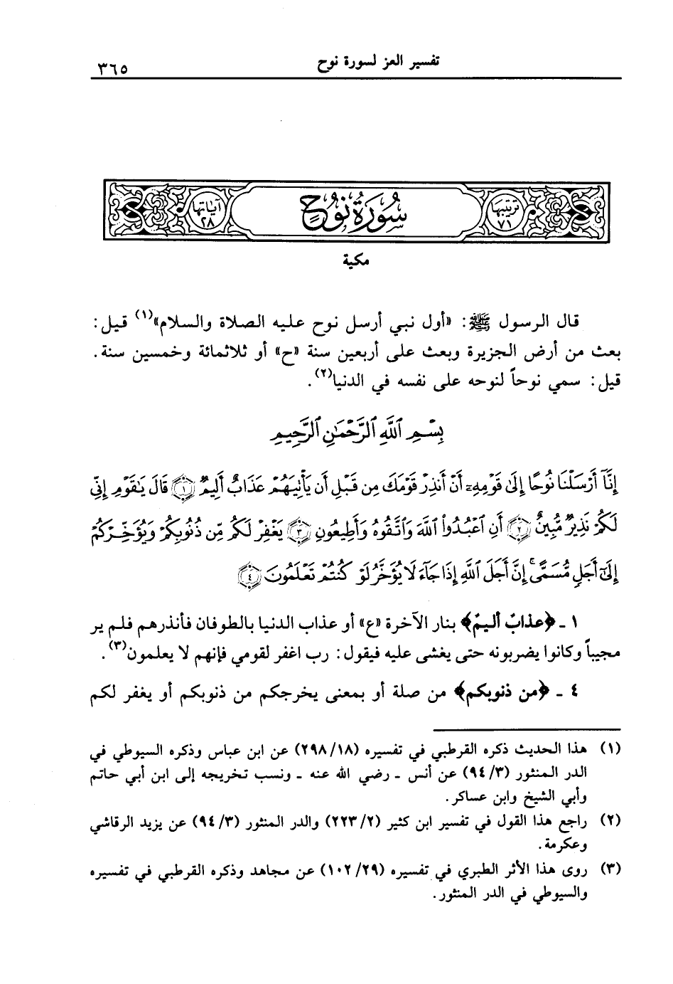 {إنَّا أرسلنا نوحاً إلى قومهِ أنْ أنذرْ قومكَ من قبلِ أن يأتيهمْ عذابٌ أليمٌ (1) قالَ ياقومِ إنِي لكمْ نذيرٌ مبينٌ (2) أنِ اعبدواْ اللهَ واتقوهُ وأطيعونِ (3) يغفرْ لكم من ذنوبكمْ ويؤخركمْ إلى أجلٍ مسمًّى إنَّ أجلَ اللهِ إذا جاءَ لا يؤخَّرُ لوْ كنتمْ تعلمونَ (4) }