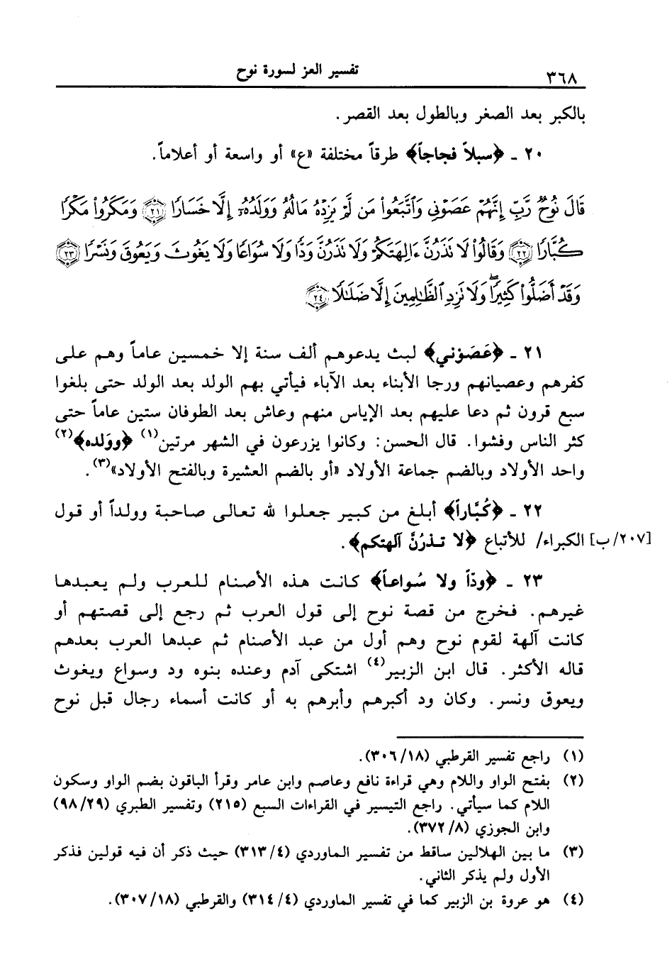 23 - {وَدّاً وَلا سُوَاعاً} كانت هذه الأصنام للعرب ولم يعبدها غيرهم. فخرج من قصة نوح إلى قول العرب ثم رجع إلى قصتهم أو كانت آلهة لقوم نوح وهم أول من عبد الأصنام ثم عبدها العرب بعدهم قاله الأكثر. قال ابن الزبير اشتكى آدم وعنده بنوه ولا وسواع ويغوث ويعوق ونسر. وكان ود أكبرهم وأبرهم به أو كانت أسماء رجال قبل نوح