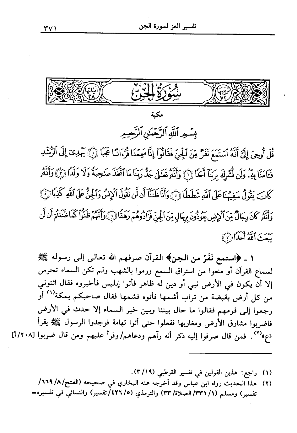 1 - {اسْتَمَعَ نَفَرٌ مِّنَ الْجِنِّ} القرآن صرفهم الله تعالى إلى رسوله [صلى الله عليه وسلم] لسماع القرآن أو منعوا من استراق السمع ورموا بالشهب ولم تكن السماء تحرس إلا أن يكون في الأرض نبي أو دين له ظاهر فأتوا إبليس فأخبروه فقال ائتوني من كل أرض بقبضة من تراب أشمها فأتوه فشمها فقال صاحبكم بمكة أو رجعوا إلى قومهم فقالوا ما حال بيننا وبين خبر السماء إلا حدث في الأرض فاضربوا مشارق الأرض ومغاربها ففعلوا حتى أتوا تهامة فوجدوا الرسول [صلى الله عليه وسلم] يقرأ " ع ". فمن قال صرفوا إليه ذكر أنه رآهم ودعاهم [208 / أ] / وقرأ عليهم ومن قال ضربوا