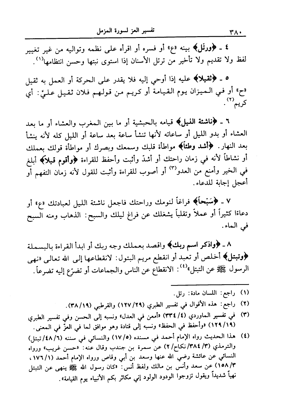 4 - {وَرَتِّلِ} بينه " ع " أو فسره أو اقرأه على نظمه وتواليه من غير تغيير لفظ ولا تقديم ولا تأخير من ترتل الأسنان إذا استوى نبتها وحسن انتظامها.