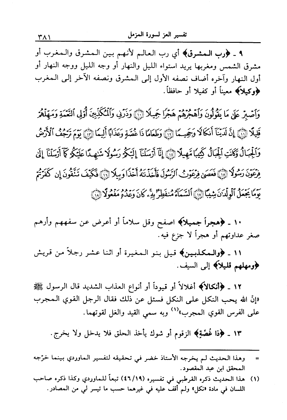 {واصبرْ على ما يقولونَ واهجرهمْ هجراً جميلاً (10) وذرني والمكذبينَ أولي النعمةِ ومهلهمْ قليلاً (11) إنَّ لدينا أنكالاً وجحيماً (12) وطعاماً ذا غصَّةٍ وعذاباً أليماً (13) يومَ ترجُفُ الأرضُ والجبالُ وكانتِ الجبالُ كثيباً مهيلاً (14) إنَّا أرسلنا إليكم رسولاً شاهداً عليكمْ كما أرسلنا إلى فرعونَ رسولاً (15) فعصى فرعونُ الرسولَ فأخذناهُ أخذاً وبيلاً (16) فكيفَ تتقونَ إن كفرتمْ يوماً يجعلُ الولدانَ شيباً (17) السماء منفطرٌ بهِ كانَ وعدهُ مفعولاً (18) }