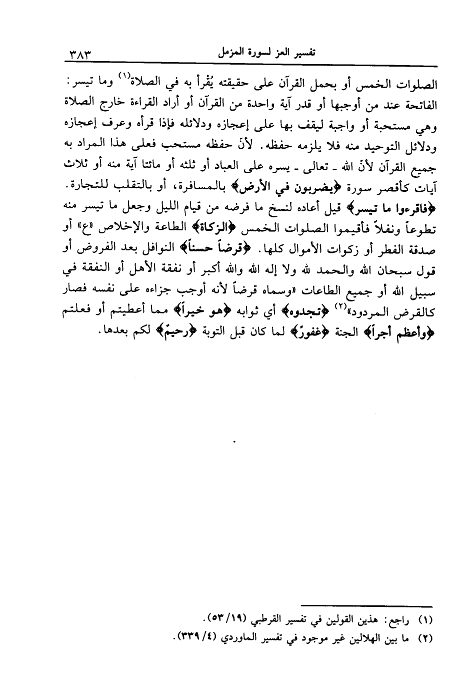 الصلوات الخمس أو بحمل القرآن على حقيقته يُقْرأ به في الصلاة وما تيسر: الفاتحة عند من أوجبها أو قدر آية واحدة من القرآن أو أراد القراءة خارج الصلاة وهي مستحبة أو واجبة ليقف بها على إعجازه ودلائله فإذا قرأه وعرف إعجازه ودلائل التوحيد منه فلا يلزمه حفظه. لأنّ حفظه مستحب فعلى هذا المراد به جميع القرآن لأنّ الله - تعالى - يسره على العباد أو ثلثه أو مائتا آية منه أو ثلاث آيات كأقصر سورة {يَضْرِبُونَ فِى الأَرْضِ} بالمسافرة، أو بالتقلب للتجارة. {فاقرءوا مَا تَيَسَّرَ} قيل أعادة لنسخ ما فرضه من قيام الليل وجعل ما تيسر منه تطوعاً ونفلاً فأقيموا الصلوات الخمس {الزَّكَاةَ} الطاعة والإخلاص " ع " أو صدقة الفطر أو زكوات الأموال كلها. {قَرْضاً حَسَناً} النوافل بعد الفروض أو قول سبحان الله والحمد لله ولا إله إلا الله والله أكبر أو نفقة الأهل أو النفقة في سبيل الله أو جميع الطاعات " وسماه قرضاً لأنه أوجب جزاءه على نفسه فصار كالقرض المردود " {تَجِدُوهُ} أي ثوابه {هُوَ خَيْراً} مما أعطيتم أو فعلتم {وَأَعْظَمَ أَجْراً} الجنة {غَفُورٌ} لما كان قبل التوبة {رحيم} لكم بعدها.