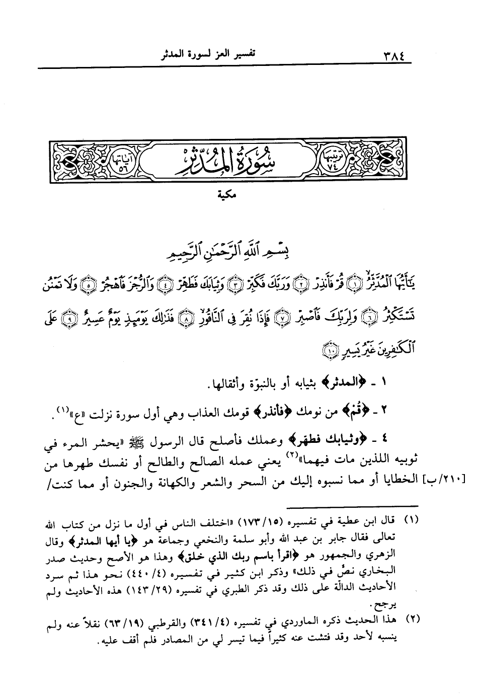 {يأيها المدثِّرُ (1) قمْ فأنذرْ (2) وربَّكَ فكبرْ (3) وثيابك فطهرْ (4) والرجزَ فاهجرْ (5) ولا تمنن تستكثرُ (6) ولربكَ فاصبر (7) فإذا نقر في الناقور (8) فذلك يومئذٍ يومٌ عسيرٌ (9) على الكافرين غيرُ يسيرٍ (10) }