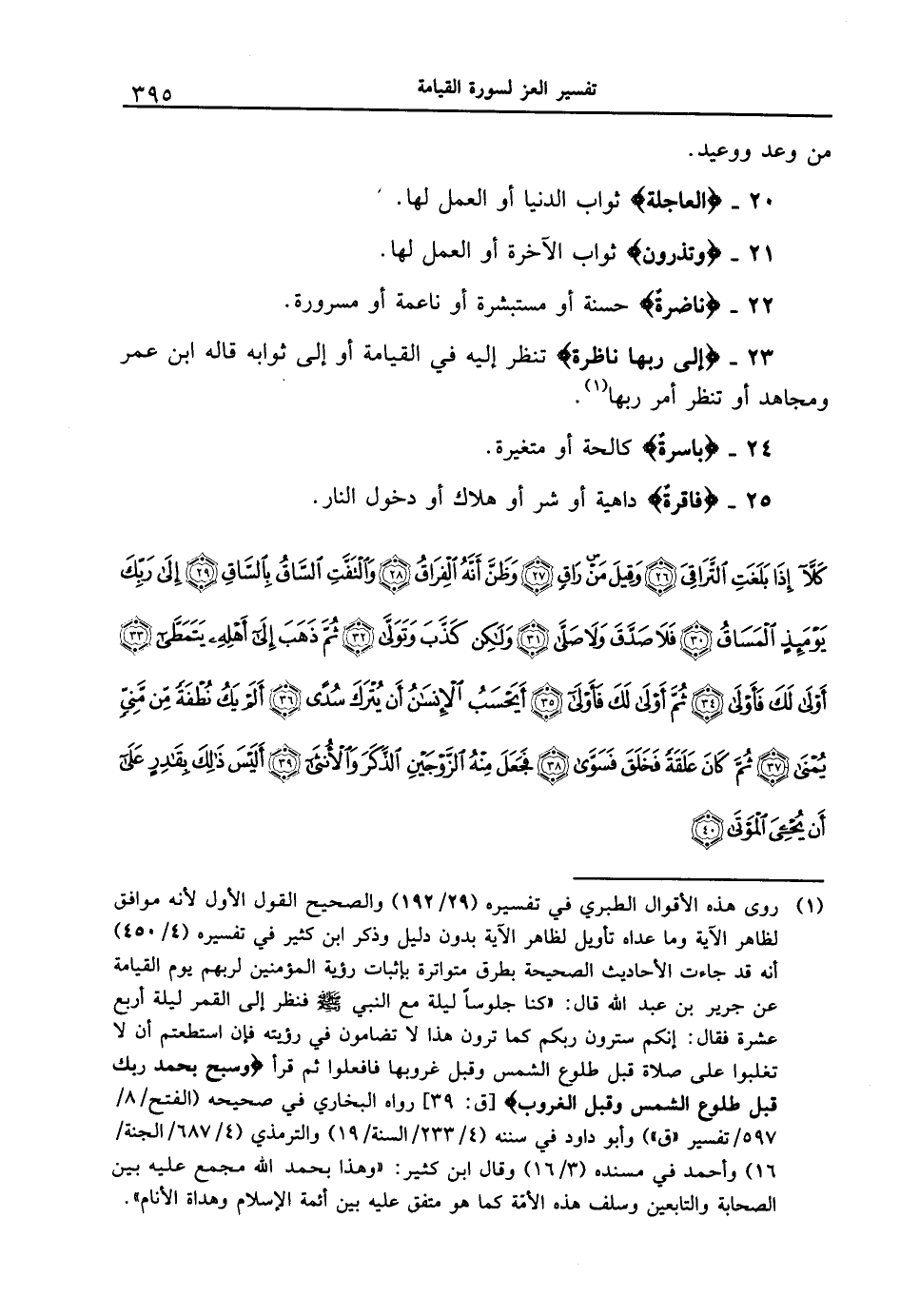 23 - {إلَى رَبِّهَا نَاظِرَةٌ} تنظر إليه في القيامة أو إلى ثوابه قاله ابن عمر ومجاهد أو تنظر أمر ربها.