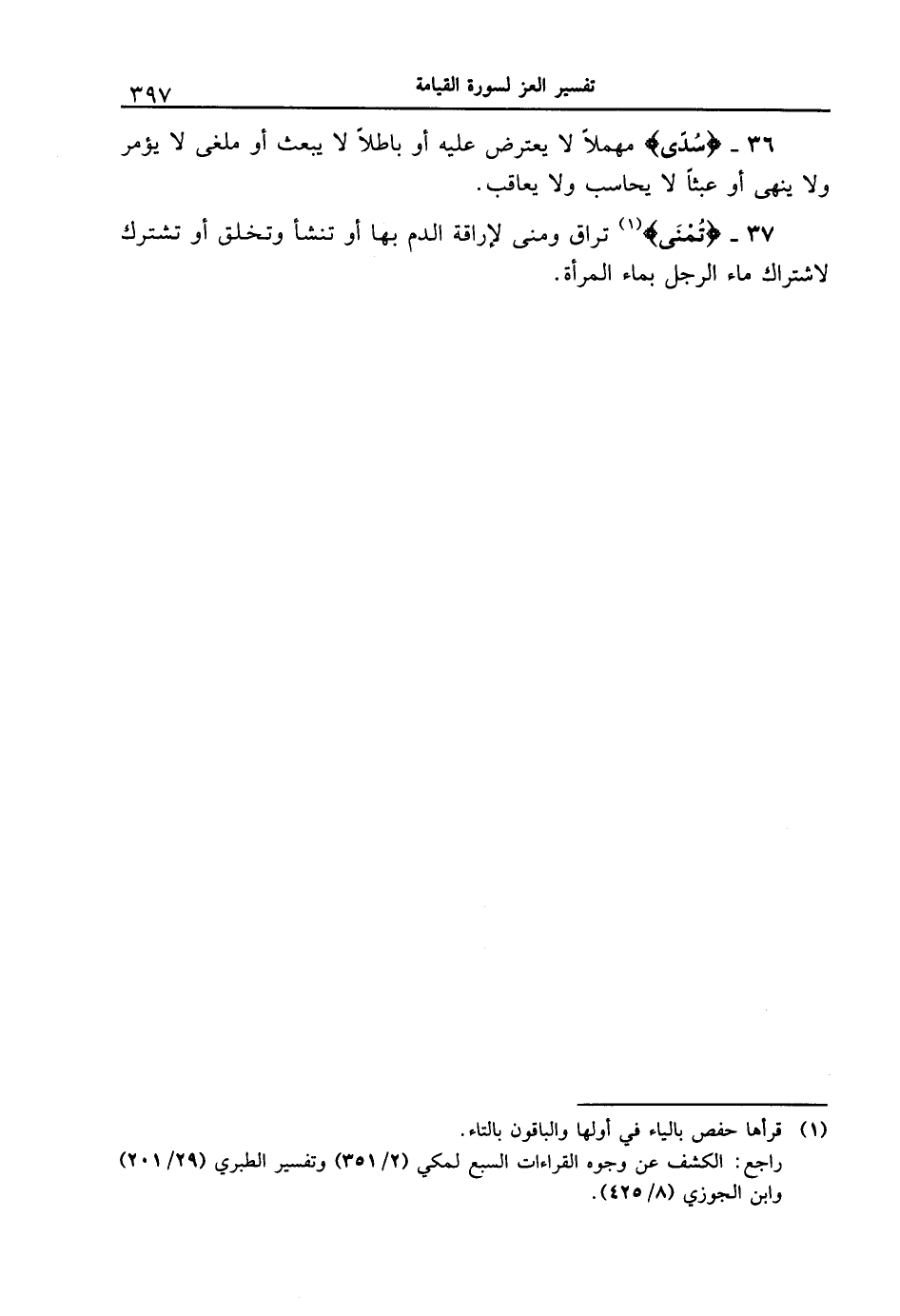 37 - {تُمْنَى} تراق ومنى لإراقة الدم بها أو تنشأ وتخلق أو تشترك لاشتراك ماء الرجل بماء المرأة.