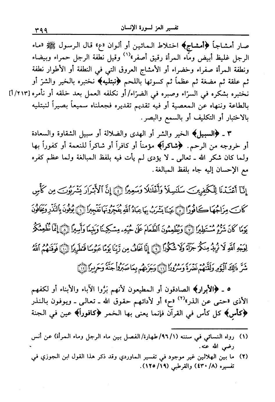 3 - {السَّبِيلَ} الخير والشر أو الهدى والضلالة أو سبيل الشقاوة والسعادة أو خروجه من الرحم. {شَاكِراً} مؤمناً أو كافراً أو شاكراً للنعمة أو كفوراً بها ولما كان شكر الله - تعالى - لا يؤدى لم يأت فيه بلفظ المبالغة ولما عظم كفره مع الإحسان إليه جاء بلفظ المبالغة.
