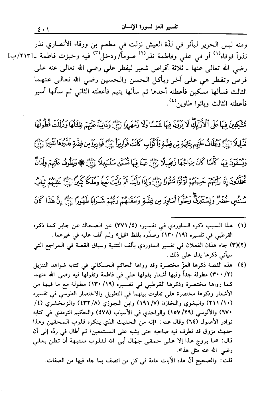 {متكئين فيها على الأرائك لا يرون فيها شمساً ولا زمهريراً (13) ودانيةً عليهم ظلالها وذللتْ قطوفها تذليلاً (14) ويطافُ عليهم بأنيةٍ من فضةٍ وأكوابٍ كانتْ قواريراْ (15) قواريراْ من فضَّةٍ قدروها تقديراً (16) ويسقونَ فيها كأساً كان مزاجُهَا زنجبيلاً (17) عيناً فيها تسمى سلسبيلاً (18) ويطوفُ عليهمْ ولدانٌ مخلدونَ إذا رأيتهمْ حسبتهمْ لؤلؤاً منثوراً (19) وإذا رأيت ثَمَّ رأيتَ نعيماً وملكاً كبيراً (20) عليهمْ ثيابُ سندسٍ خضرٌ وإستبرقٌ وحلواْ أساورَ من فضةٍ وسقاهمْ ربهمْ شراباً طهوراً (21) إنَّ هذا كانَ