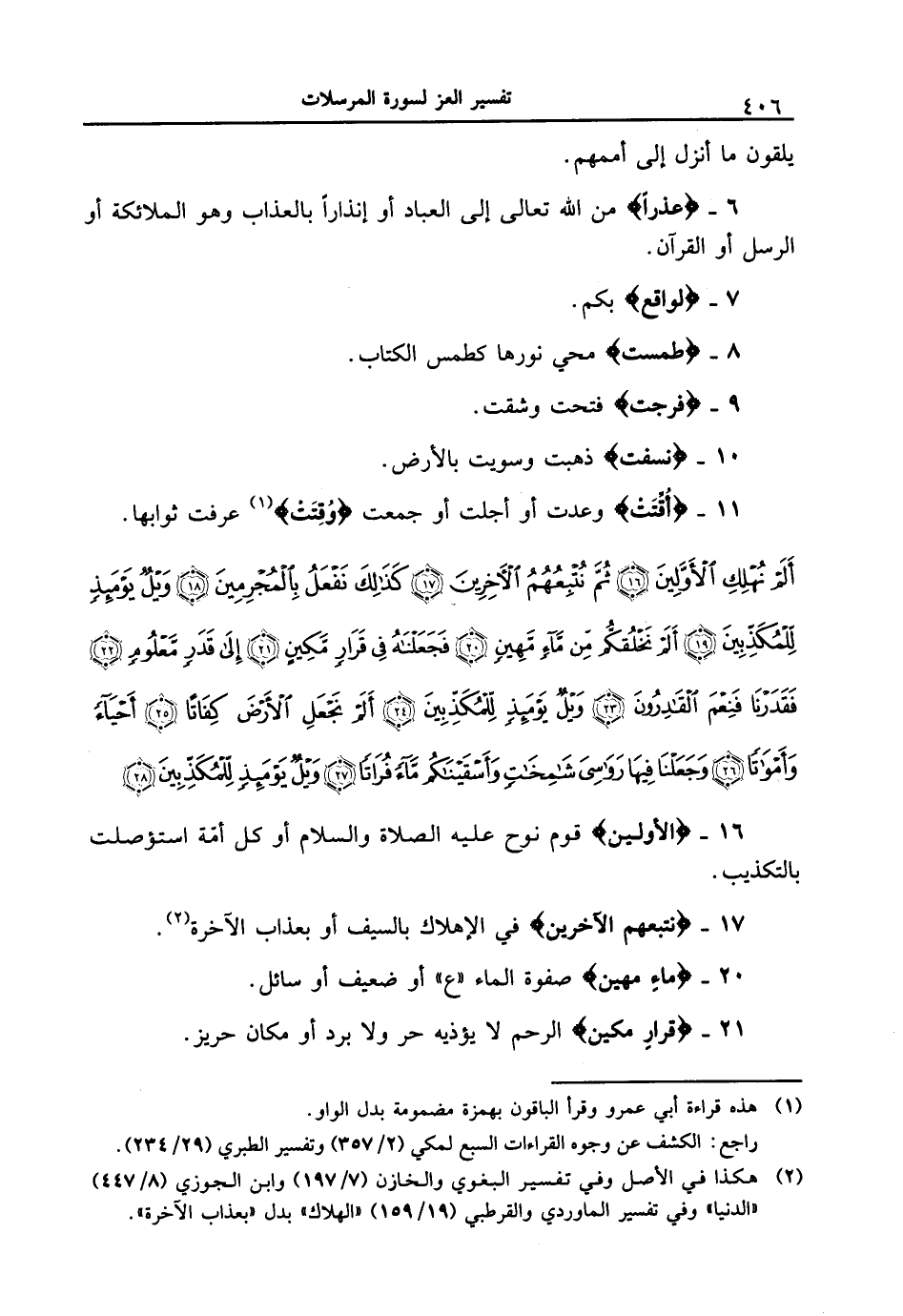{ألمْ نهلكِ الأولينَ (16) ثمَّ نتبعُهُمُ الأخرينَ (17) كذلكَ نفعلُ بالمجرمينَ (18) ويلٌ يومئذٍ للمكذبينَ (19) ألم نخلقكم من ماءٍ مهينٍ (20) فجعلناهُ في قرارٍ مكينٍ (21) إلى قدرٍ معلومٍ (22) فقدرنَا فنعمَ القادرونَ (23) ويلٌ يومئذٍ للمكذبينَ (24) ألمْ نجعلِ الأرضَ كفاتاً (25) أحياءً وأمواتاً (26) وجعلنا فيها رواسي شامخاتٍ وأسقيناكمْ ماءً فراتاً (27) ويلٌ يومئذٍ للمكذبينَ (28) }