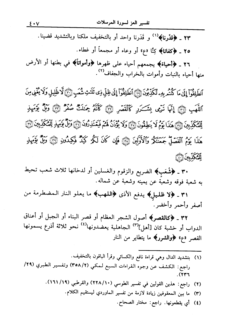 32 - {كَالْقَصْرِ} أصول الشجر العظام أو قصر البناء أو الجبل أو أعناق الدواب أو خشبة كان [أهل] الجاهلية يعضدونها نحو ثلاثة أذرع يسمونها القصر " ع " {والشرر} ما يتطاير من النار.