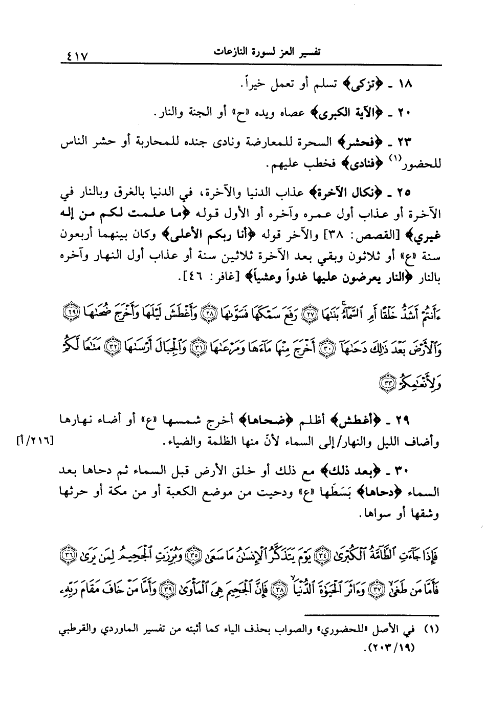 25 - {نَكَالَ الأَخِرَةِ} عذاب الدنيا والآخرة، في الدنيا بالغرق وبالنار في الآخرة أو عذاب أول عمره وآخره أو الأول قوله {ما عَلِمْتُ لَكُمْ مِّنْ إله غَيْرِى} [القصص: 38] والآخر قوله {أَنَاْ رَبُّكُمُ الأَعْلَى} وكان بينهما أربعون سنة " ع " أو ثلاثون وبقي بعد الآخرة ثلاثين سنة أو عذاب أول النهار وآخره بالنار {النار يُعْرَضُونَ عَلَيْهَا غُدُوّاً وَعَشِيّاً} [غافر: 46] .