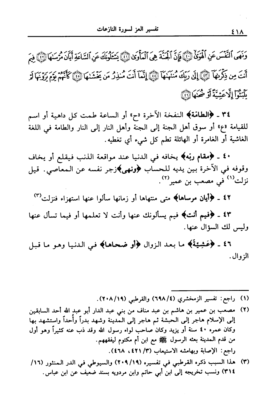 ونهى النفسَ عنِ الهوىَ (40) فإنَّ الجنةَ هيَ المأوى (41) يسألونَكَ عنِ الساعةِ أيانَ مرساها (42) فيمَ أنتَ من ذكراها (43) إلى ربكَ منتهاها (44) إنما أنتَ منذرُ من يخشاها (45) كأنهمْ يومَ يرونها لمْ يلبثوا إلاَّ عشيةً أو ضحاها (46) }