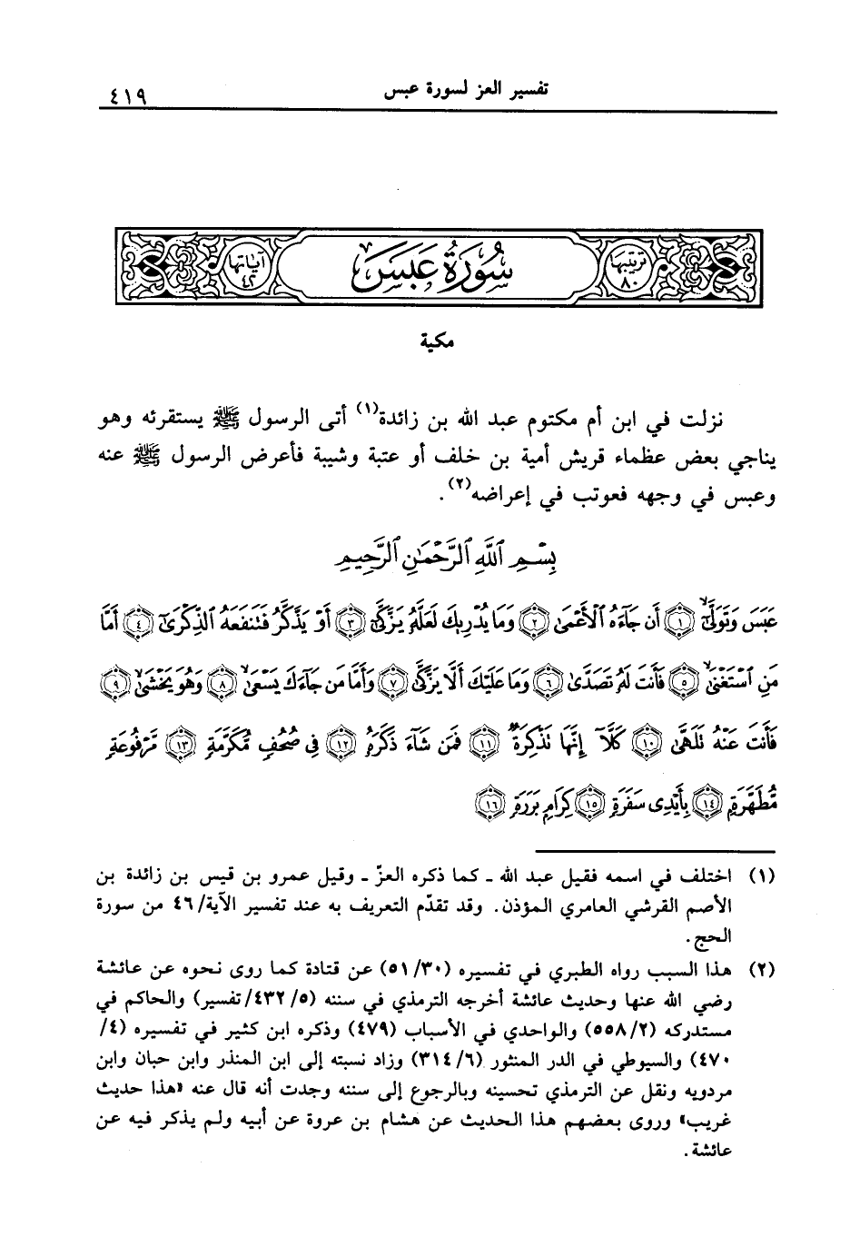 {عبس وتولى (1) أن جاءه الأعمى (2) وما يدريك لعله يزكى (3) أو يذكر فتنفعه الذكرى (4) أما من استغنى (5) فأنت له تصدى (6) وما عليك ألا يزكى (7) وأما من جاءك يسعى (8) وهو يخشى (9) فأنت عنه تلهى (10) كلا إنها تذكرة (11) فمن شاء ذكره (12) في صحفٍ مكرمة (13) مرفوعة مطهرة (14) بأيدي سفرة (15) كرامٍ بررة (16) }