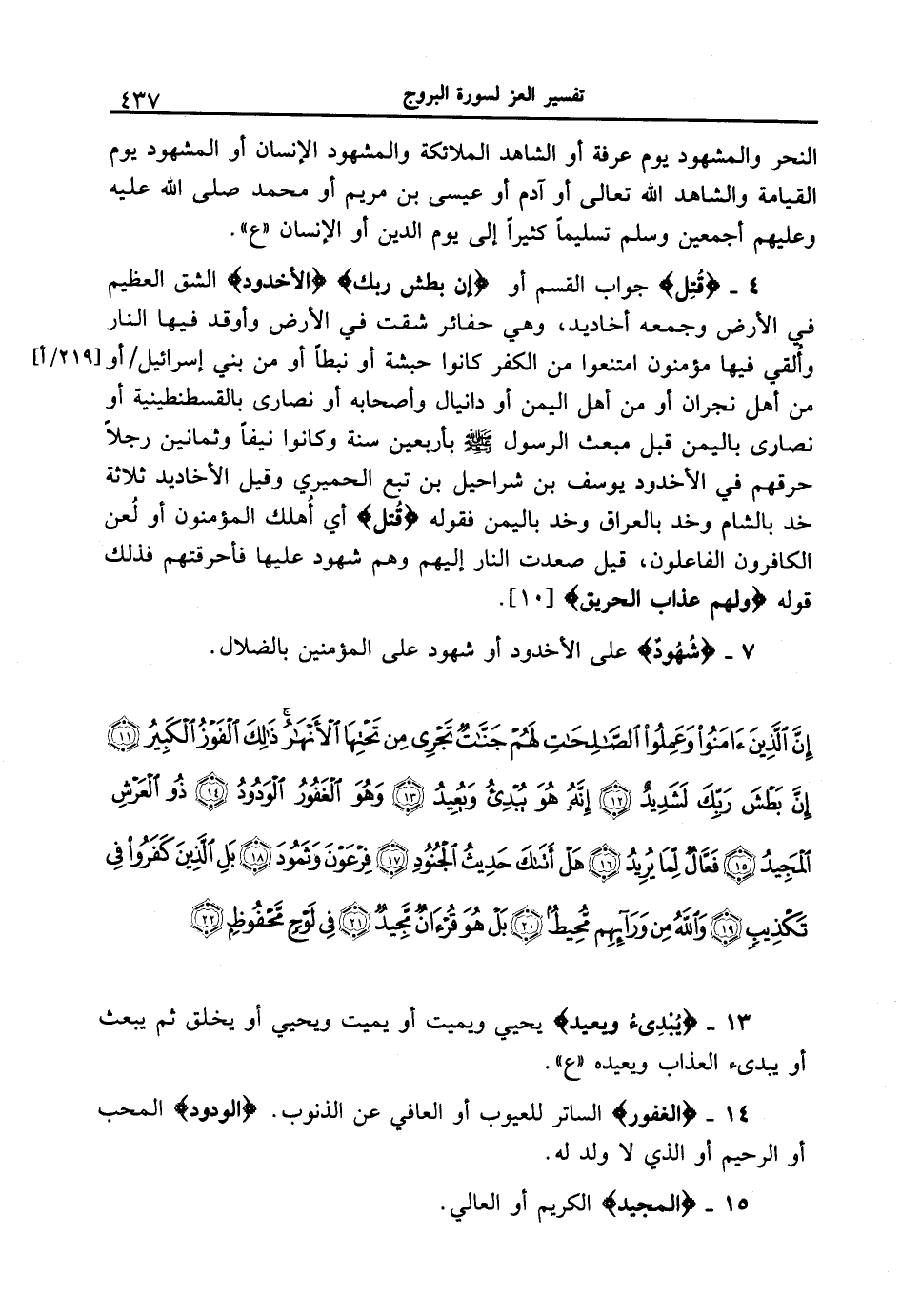 {إن الذين ءامنوا وعملوا الصالحات لهم جناتُ تجري من تحتها الأنهار ذلك الفوز الكبير (11) إن بطش ربك لشديد (12) إنه هو يبدئ ويعيد (13) وهو الغفور الودود (14) ذو العرش المجيد (15) فعال لما يريد (16) هل أتاك حديث الجنود (17) فرعون وثمود (18) بل الذين كفروا في تكذيب (19) والله من ورائهم محيط (20) بل هو قرانٌ مجيد (21) في لوحٍ محفوظٍ (22) }