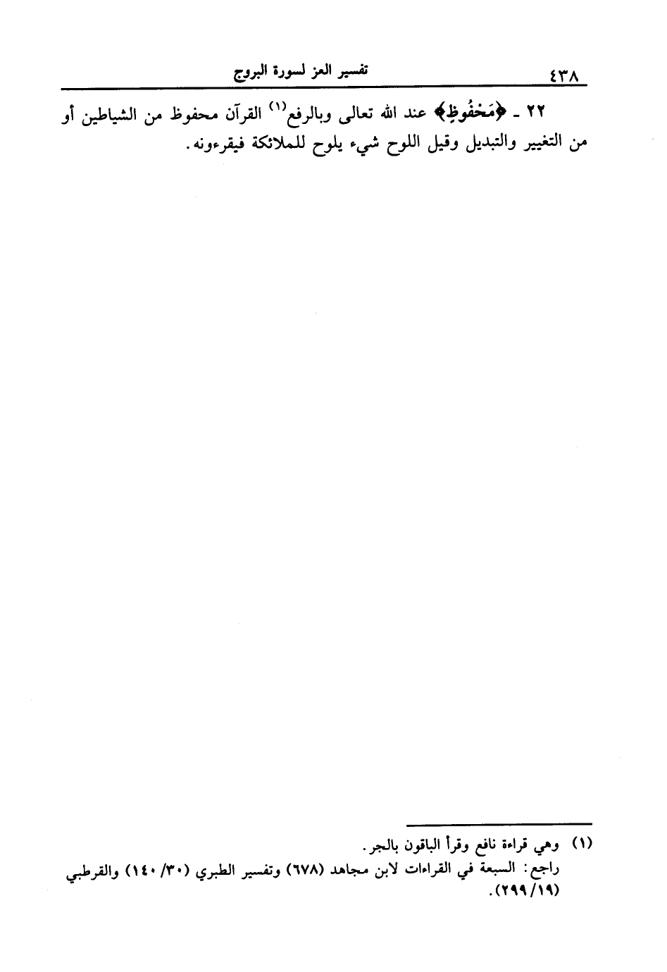 22 - {مَّحْفُوظٍ} عند الله تعالى وبالرفع القرآن محفوظ من الشياطين أو من التغيير والتبديل وقيل اللوح شيء يلوح للملائكة فيقرءونه.