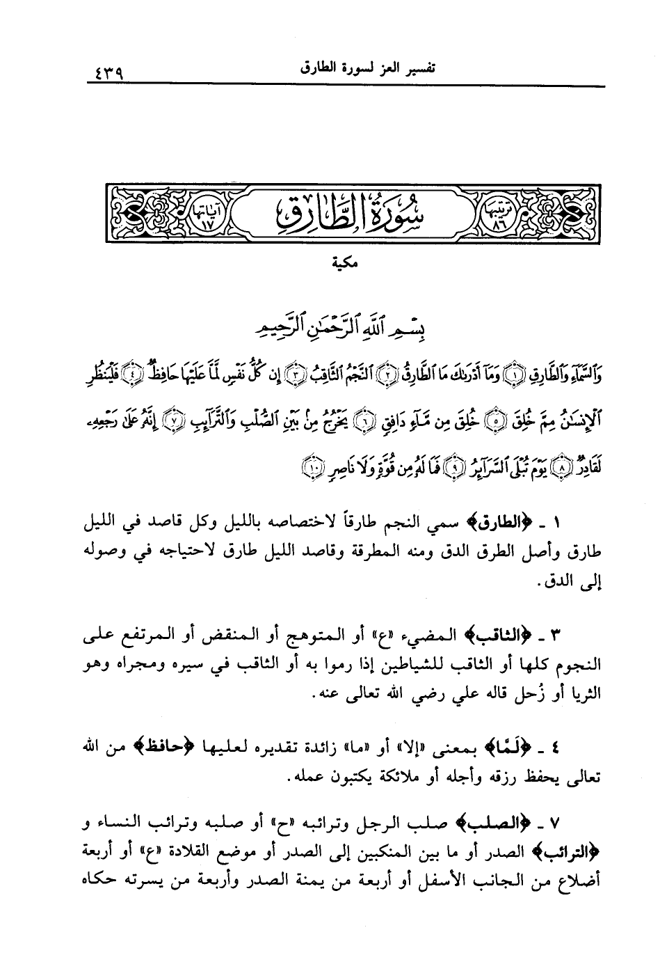 {والسماء والطارق (1) وما أدراك ما الطارق (2) النجم الثاقب (3) إن كل نفسٍ لما عليها حافظ (4) فلينظر الإنسان ممن خلق (5) خلق من ماء دافق (6) يخرج من بين الصلب والترائب (7) إنه على رجعه لقادر (8) يوم تبلى السرائر (9) فما له من قوةٍ ولا ناصر (10) 1 - {الطَّارِقُ} سمي النجم طارقاً لاختصاصه بالليل وكل قاصد في الليل طارق وأصل الطرق الدق ومنه المطرقة وقاصد الليل طارق لاحتياجه في وصوله إلى الدق.
