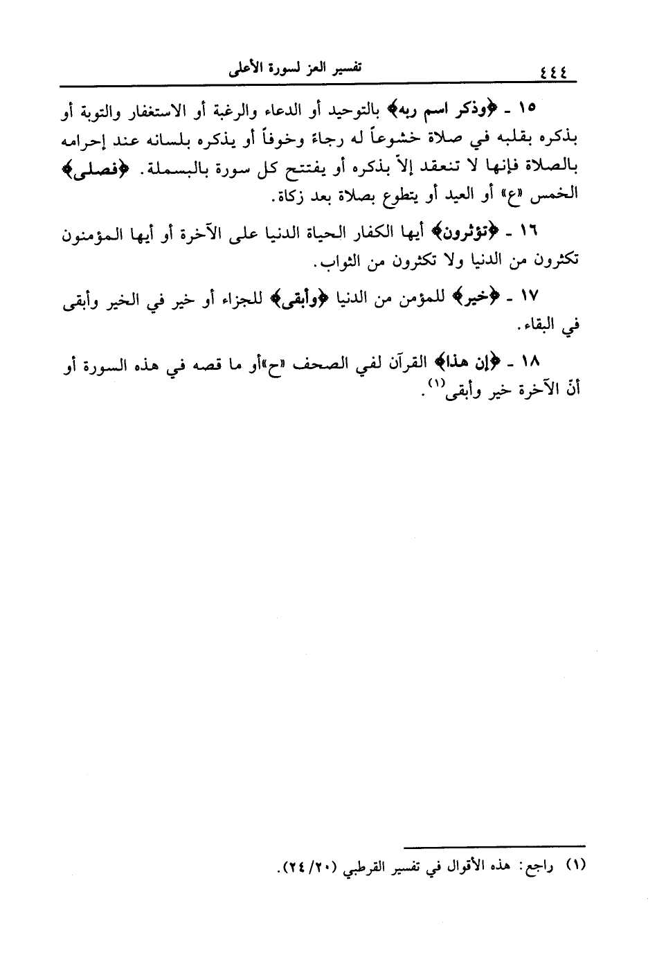 15 - {وَذَكَرَ اسْمَ رَبِّهِ} بالتوحيد أو الدعاء والرغبة أو الاستغفار والتوبة أو بذكره بقلبه في صلاة خشوعاً له رجاءً وخوفاً أو يذكره بلسانه عند إحرامه بالصلاة فإنها لا تنعقد إلاّ بذكره أو يفتتح كل سورة بالبسملة. {فَصَلَّى} الخمس " ع " أو العيد أو يتطوع بصلاة بعد زكاة.