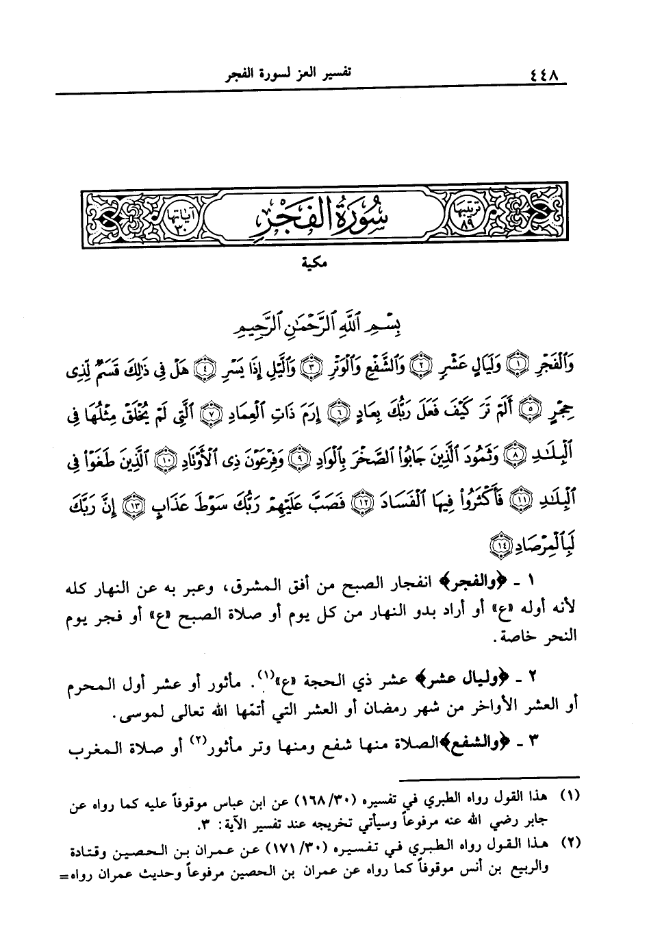 1 - {وَالْفَجْرِ} انفجار الصبح من أفق المشرق، وعبر به عن النهار كله لانه أوله " ع " أو أرد بدر النهار في كل يوم أو صلاة الصبح " ع " أو فجر يوم النحر خاصة.