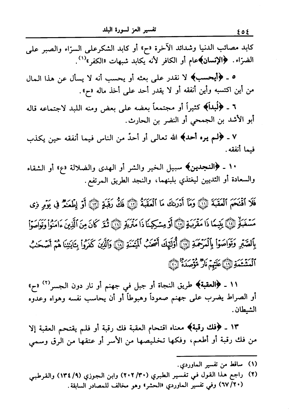 11 - {الْعَقَبَةَ} طريق النجاة أو جبل في جهنم أو نار دون الجسر " ح " أو الصراط يضرب على جهنم صعوداً وهبوطاً أو أن يحاسب نفسه وهواه وعدوه الشيطان.
