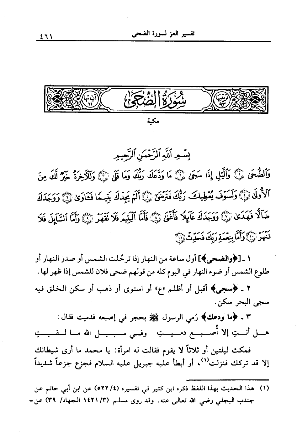 {والضحى (1) والليل إذا سجى (2) ما وعدك ربك وما قلى (3) وللآخرة خيرٌ لك من الأولى (4) ولسوف يعطيك ربك فترضى (5) ألم يجدك يتيماً فآوى (6) ووجدك ضالاً فهدى (7) ووجدك عائلاً فأغنى (8) فأما اليتيم فلا تقهر (9) وأما السائل فلا تنهر (10) وأما بنعمة ربك فحدث (11) }