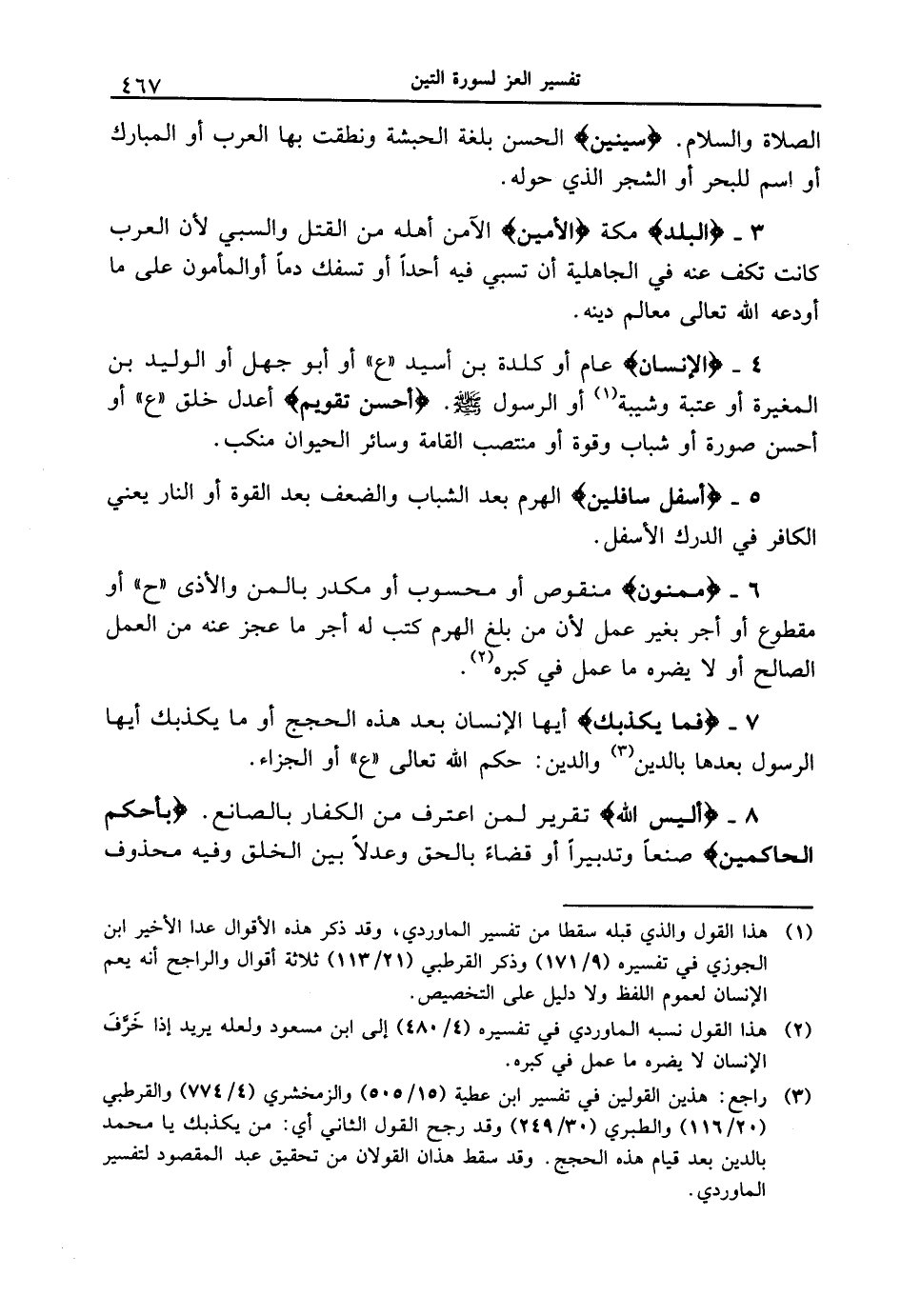 5 - {أَسْفَلَ سَافِلينَ} الهرم بعد الشباب والضعف بعد القوة أو النار يعني الكافر في الدرك الأسفل.
