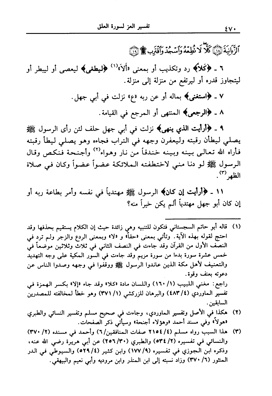 9 - {أرأيت الَّذِى يَنْهَى} نزلت في أبي جهل حلف لئن رأى الرسول [صلى الله عليه وسلم] يصلي ليطأن رقبته وليعفرن وجهه في التراب فجاءه وهو يصلي ليطأ رقبته فأراه الله تعالى بينه وبينه خندقاً من نار وهواء وأجنحة فنكص وقال الرسول [صلى الله عليه وسلم] لو دنا مني لاختطفته الملائكة عضواً عضواً وكان في صلاة الظهر.