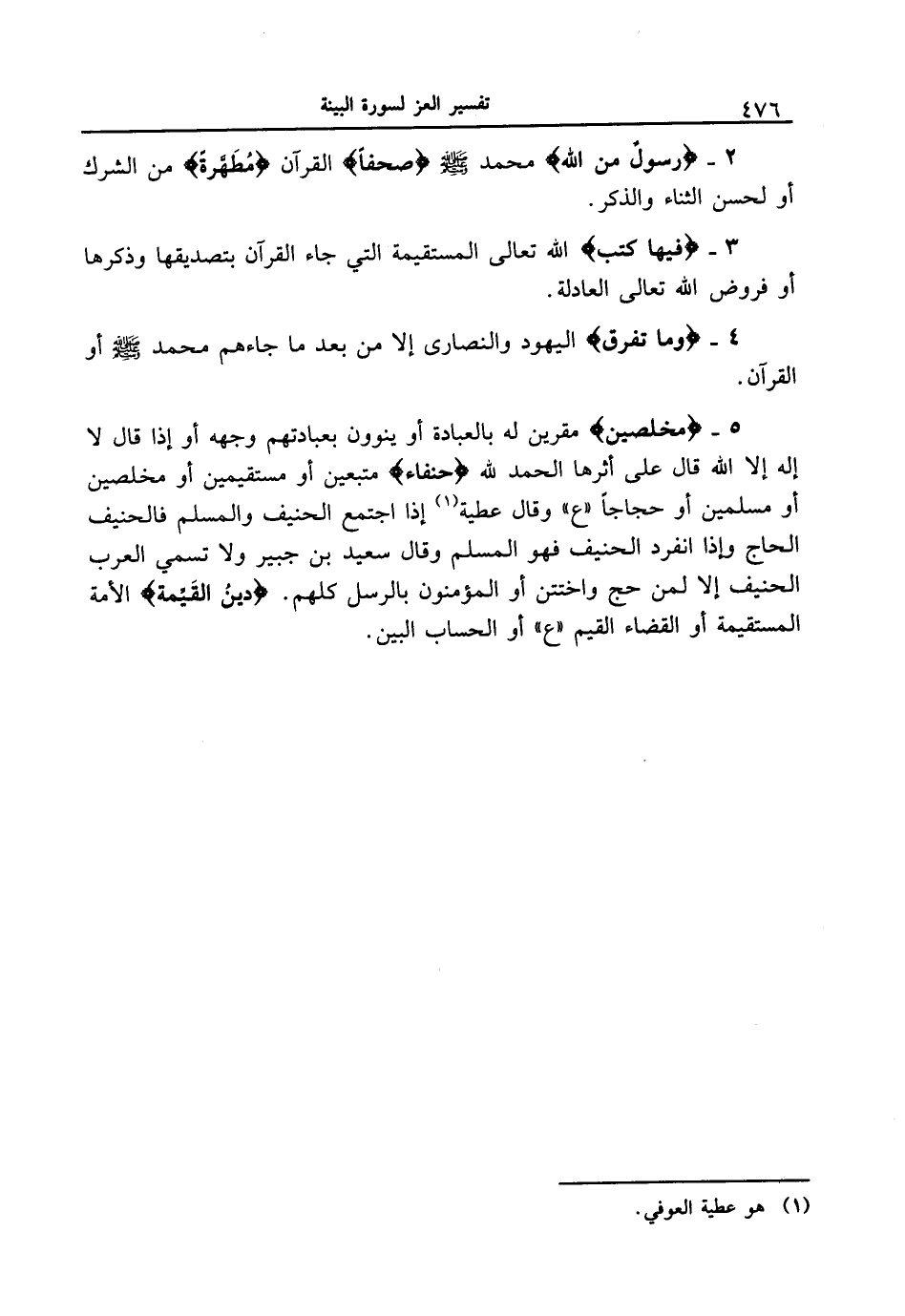 5 - {مُخْلِصِينَ} مقرين له بالعبادة أو ينوون بعبادتهم وجهه أو إذا قال لا إله إلا الله قال على أثرها الحمد لله {حُنَفَآءَ} متبعين أو مستقيمين أو مخلصين أو مسلمين أو حجاجاً " ع " وقال عطية إذا اجتمع الحنيف والمسلم فالحنيف الحاج وإذا انفرد الحنيف فهو المسلم وقال سعيد بن جبير ولا تسمي العرب الحنيف إلا لمن حج واختتن أو المؤمنون بالرسل كلهم. {دِينُ الْقَيِّمَةِ} الأمة المستقيمة أو القضاء القيم " ع " أو الحساب البين.