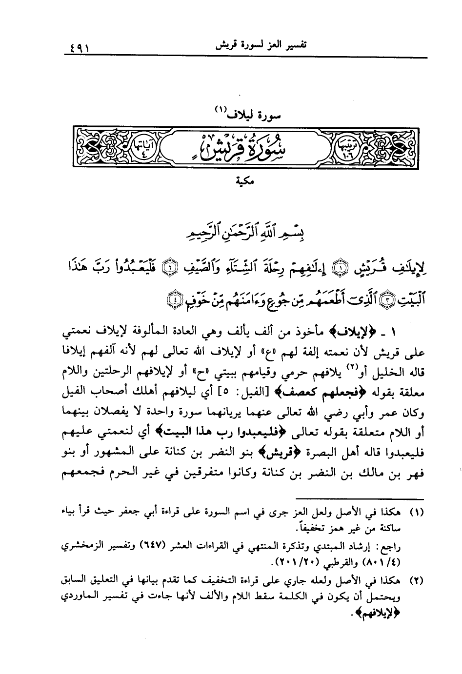 1 - {لإيلاف} مأخوذ من ألف بألف وهي العادة المألوفة لإيلاف نعمتي على قريش لأن نعمته إلفة لهم " ع " أو لإيلاف الله تعالى لهم لأنه آلفهم إيلافاً قال له الخليل أو يلافهم حرمي وقيامهم ببيتي " ح " أو لإيلافهم الرحلتين واللام معلقة بقوله {فَجَعَلَهُمْ كَعَصْفٍ} [الفيل: 5] أي ليلافهم أهلك أصحاب الفيل وكان عمر وأبي رضي الله تعالى عنهما يريانهما سورة واحدة لا يفصلان بينهما أو اللام متعلقة بقوله تعالى {فَلْيَعْبُدُواْ رَبَّ هَذَا الْبَيْتِ} أي لنعمتي عليهم فليعبدوا قاله أهل البصرة {قُرَيْشٍ} بنو النضر بن كنانة على المشهور أو بنو فهر بن مالك بن النضر بن كنانة وكانوا متفرقين في غير الحرم فجمعهم