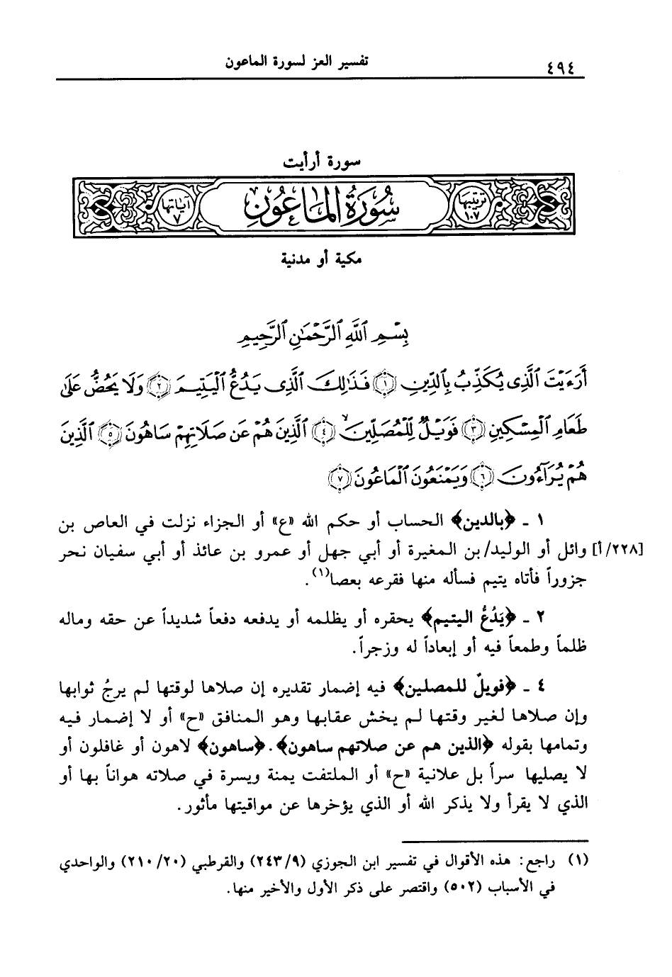 1 - {بِالدِّينِ} الحساب أو حكم الله " ع " أو الجزاء نزلت في العاص بن وائل أو الوليد [228 / أ] بن المغيرة أو أبي جهل أو عمرو بن عائذ أو أبي سفيان نحر جزوراً فأتاه يتيم فسأله منها فقرعه بعصا.