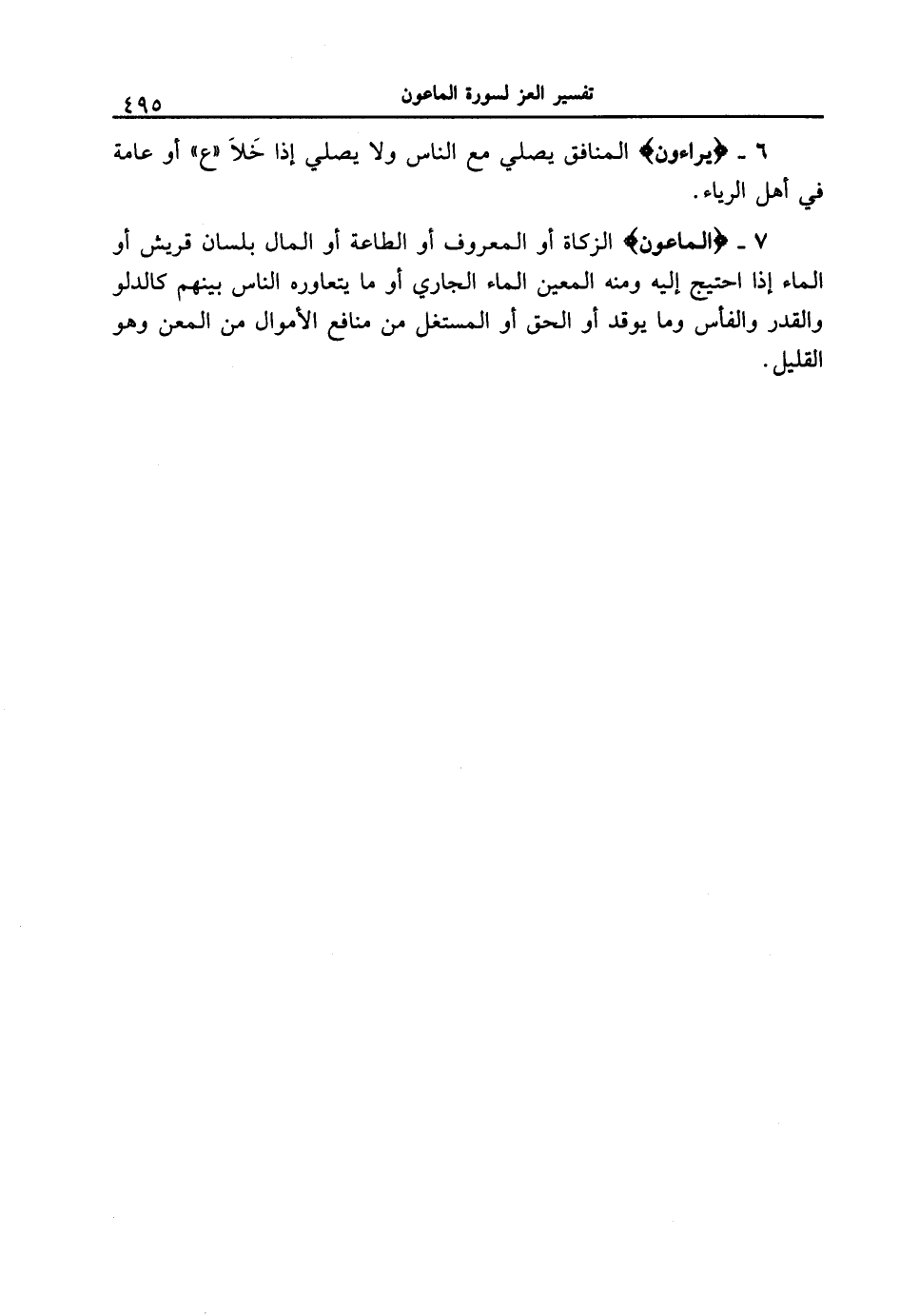 7 - {الْمَاعُونَ} الزكاة أو المعروف أو الطاعة أو المال بلسان قريش أو الماء إذا احتيج إليه ومنه المعين الماء الجاري أو ما يتعاوره الناس بينهم كالدلو والقدر والفأس وما يوقد أو الحق أو المستغل من منافع الأموال من المعن وهو القليل.