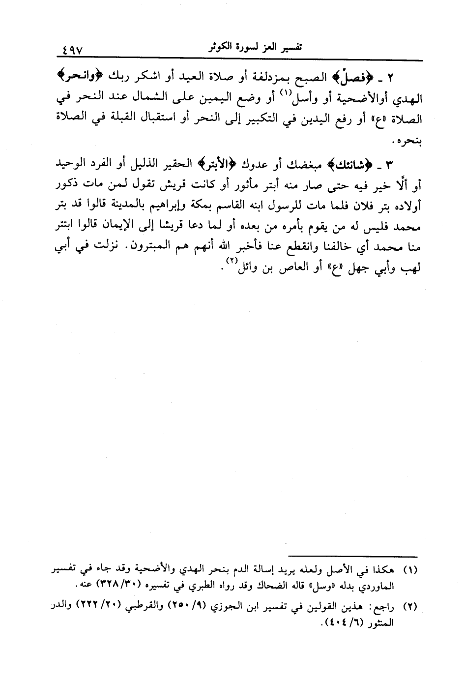 2 - {فَصَلِّ} الصبح بمزدلفة أو صلاة العيد أو اشكر ربك {وَانْحَرْ} الهدي أو الأضحية أو وأسل أو وضع اليمين على الشمال عند النحر في الصلاة " ع " أو رفع اليدين في التكبير إلى النحر أو استقبال القبلة في الصلاة بنحره.