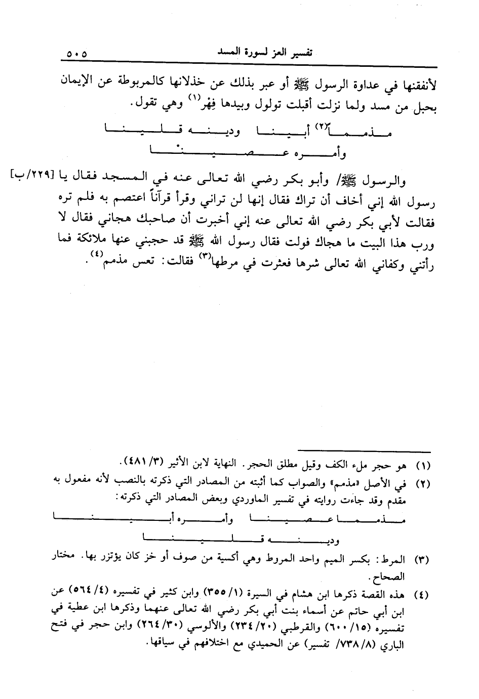 والرسول [صلى الله عليه وسلم] [229 / ب] / وأبو بكر رضي الله تعالى عنه في المسجد فقال يا رسول الله إني أخاف أن تراك فقال إنها لن تراني وقرأ قرآناً اعتصم به فلم تره فقالت لأبي بكر رضي الله تعالى عنه إني أخبرت أن صاحبك هجاني فقال لا ورب هذا البيت ما هجاك فولت فقال رسول الله [صلى الله عليه وسلم] قد حجبني عنها ملائكة فما رأتني وكفاني الله تعالى شرها فعثرت في مرطها فقالت: تعس مذمم.