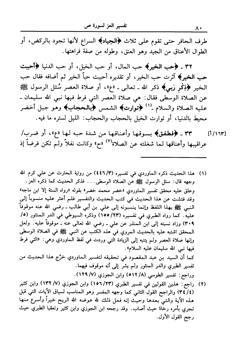 33 - {فَطَفِقَ} بسوقها وأعناقها من شدة حبه لها " ع "، أو ضرب [163 / أ] / عراقيبها وأعناقها لما شغلته عن الصلاة " ح " وكانت نفلاً ولم تكن فرضاً إذ