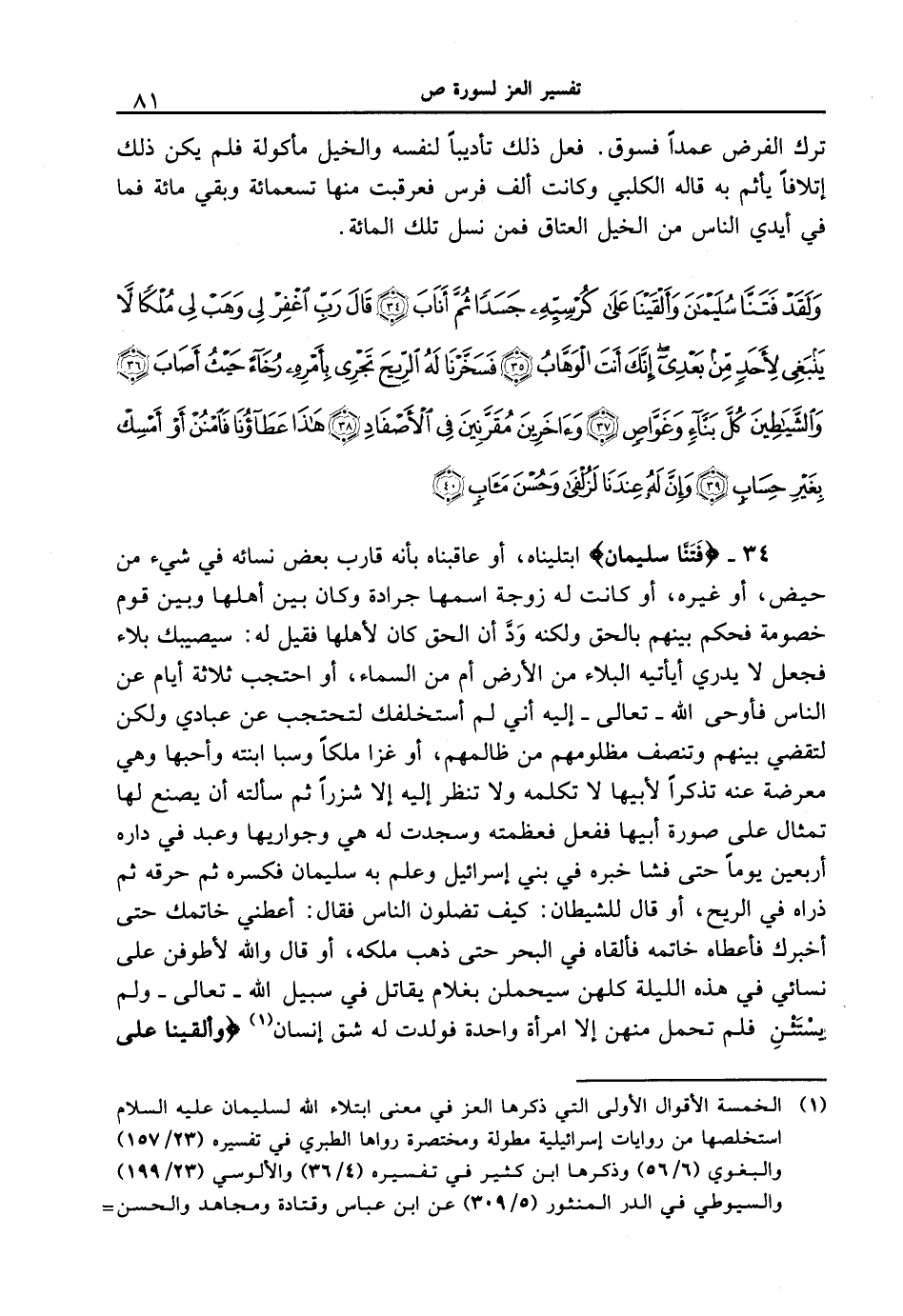 34 - {فَتَنَّا سُلَيْمَانَ} ابتليناه، أو عاقبناه بأنه قارب بعض نسائه في شيء من حيض، أو غيره، أو كانت له زوجة اسمها جرادة وكان بين أهلها وبين قوم خصومة فحكم بينهم بالحق ولكنه وَدَّ أن الحق كان لأهلها فقيل له: سيصيبك بلاء فجعل لا يدري أيأتيه البلاء من الأرض أم من السماء، أو احتجب ثلاث أيام عن الناس فأوحى الله - تعالى - إليه إني لم أستخلفك لتحتجب عن عبادي ولكن لتقضي بينهن وتنصف مظلومهم من ظالمهم، أم غزا ملكاً وسبا ابنته وأحبها وهي معرضة عنه تذكراً لأبيها لا تكلمه ولا تنظر إليه إلا شزراً ثم سألته أن يصنع لها تمثال على صورة أبيها ففعل فعظمته وسجدت له هي وجواريها وعبد في داره إربعين يوماً حتى فشا خبره في بني إسرائيل وعلم به سليمان فكسره ثم حرقه ثم ذراه في الريح، أو قال للشيطان: كيف تضلون الناس فقال: أعطني خاتمك حتى أخبرك فأعطاه خاتمه فألقاه في البحر حتى ذهب ملكه، أو قال والله لأطوفن على نسائي في هذه الليلة كلهن سيحملن بغلام يقاتل في سبيل الله - تعالى - ولم يسْتَثْنِ فلم تحمل منهم إلا امرأة واحدة فولدت له شق إنسان {وألقينا على