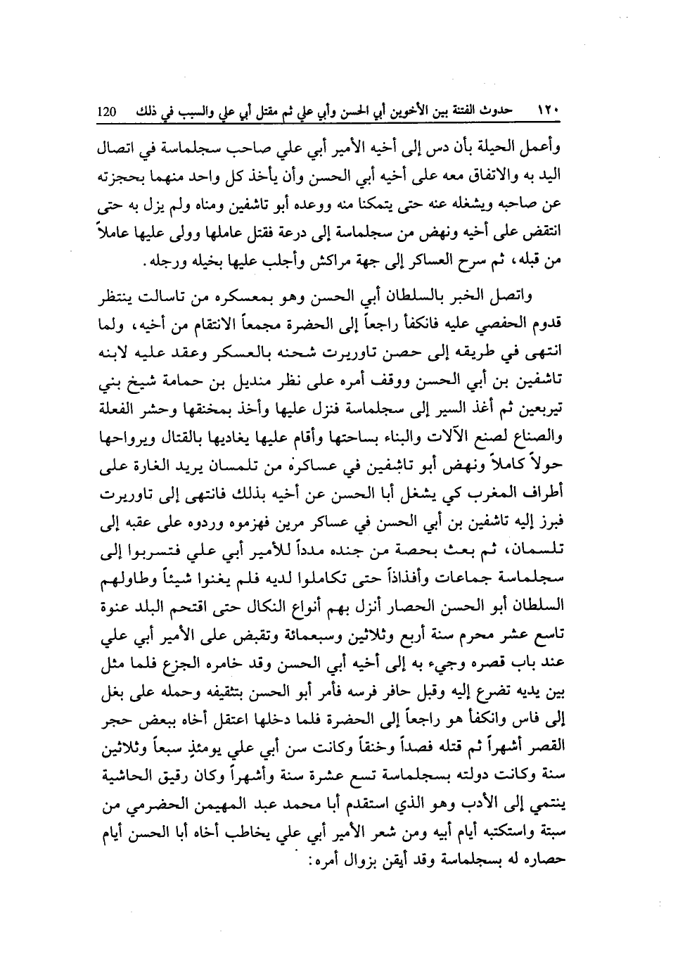 واتصل الْخَبَر بالسلطان أبي الْحسن وَهُوَ بمعسكره من تاسالت ينْتَظر قدوم الحفصي عَلَيْهِ فانكفأ رَاجعا إِلَى الحضرة مجمعا الانتقام من أَخِيه وَلما انْتهى فِي طَرِيقه إِلَى حصن تاوريرت شحنه بالعسكر وَعقد عَلَيْهِ لِابْنِهِ تاشفين بن أبي الْحسن ووقف أمره على نظر منديل بن حمامة شيخ بني تيربعين ثمَّ أغذ السّير إِلَى سجلماسة فَنزل عَلَيْهَا وَأخذ بمخنقها وَحشر الفعلة والصناع لصنع الْآلَات وَالْبناء بساحتها وَأقَام عَلَيْهَا يغاديها بِالْقِتَالِ ويراوحها حولا كَامِلا ونهض أَبُو تاشفين فِي عساكره من تلمسان يُرِيد الْغَارة على أَطْرَاف الْمغرب كي يشغل أَبَا الْحسن عَن أَخِيه بذلك فَانْتهى إِلَى تاوريرت فبرز إِلَيْهِ تاشفين بن ابي الْحسن فِي عَسَاكِر مرين فهزموه وردوه على عقبه إِلَى تلمسان ثمَّ بعث بِحِصَّة من جنده مدَدا للأمير أبي عَليّ فتسربوا إِلَى سجلماسة جماعات وأفذاذا حَتَّى تكاملوا لَدَيْهِ فَلم يغنوا شَيْئا وطاولهم السُّلْطَان أَبُو الْحسن الْحصار أنزل بهم أَنْوَاع النكال حَتَّى اقتحم الْبَلَد عنْوَة تَاسِع عشر محرم سنة أَربع وَثَلَاثِينَ وَسَبْعمائة وتقبض على الْأَمِير أبي عَليّ عِنْد بَاب قصره وَجِيء بِهِ إِلَى أَخِيه أبي الْحسن وَقد خامره الْجزع فَلَمَّا مثل بَين يَدَيْهِ تضرع إِلَيْهِ وَقبل حافر فرسه فَأمر أَبُو الْحسن بتثقيفه وَحمله على بغل إِلَى فاس وانكفأ هُوَ رَاجعا إِلَى الحضرة فَلَمَّا دَخلهَا اعتقل أَخَاهُ بِبَعْض حجر الْقصر أشهرا ثمَّ قَتله فصدا وخنقا وَكَانَت سنّ أبي عَليّ يَوْمئِذٍ سبعا وَثَلَاثِينَ سنة وَكَانَت دولته بسجلماسة تسع عشرَة سنة وأشهرا وَكَانَ رَقِيق الْحَاشِيَة ينتمي إِلَى الْأَدَب وَهُوَ الَّذِي استقدم ابا مُحَمَّد عبد الْمُهَيْمِن الْحَضْرَمِيّ من سبتة واستكتبه أَيَّام أَبِيه وَمن شعر الْأَمِير أبي عَليّ يُخَاطب أَخَاهُ أَبَا الْحسن أَيَّام حصاره لَهُ بسجلماسة وَقد أَيقَن بِزَوَال أمره
