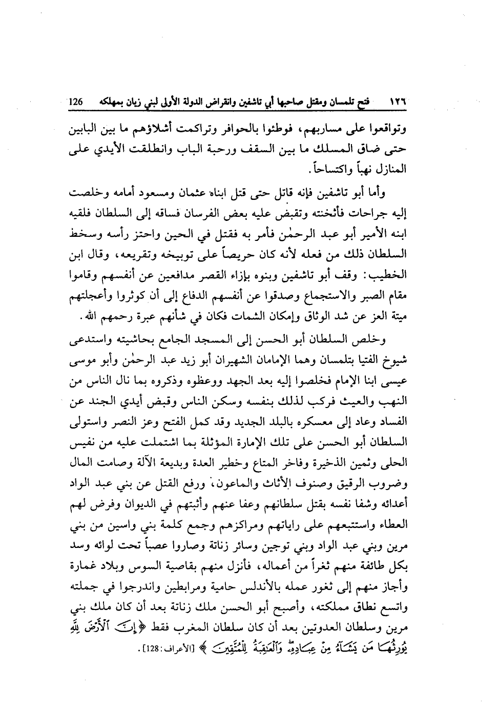 وخلص السُّلْطَان أَبُو الْحسن إِلَى الْمَسْجِد الْجَامِع بحاشيته واستدعى شُيُوخ الْفتيا بتلمسان وهما الإمامان الشهيران أَبُو زيد عبد الرَّحْمَن وَأَبُو مُوسَى عِيسَى ابْنا الإِمَام فخلصوا إِلَيْهِ بعد الْجهد ووعظوه وذكروه بِمَا نَالَ النَّاس من النهب والعيث فَركب لذَلِك بِنَفسِهِ وَسكن النَّاس وَقبض أَيدي الْجند عَن الْفساد وَعَاد إِلَى مُعَسْكَره بِالْبَلَدِ الْجَدِيد وَقد كمل الْفَتْح وَعز النَّصْر وَاسْتولى السُّلْطَان أَبُو الْحسن على تِلْكَ الْإِمَارَة المؤثلة بِمَا اشْتَمَلت عَلَيْهِ من نَفِيس الحلى وثمين الذَّخِيرَة وفاخر الْمَتَاع وخطير الْعدة وبديعة الْآلَة وصامت المَال وضروب الرَّقِيق وصنوف الأثاث والماعون وَرفع الْقَتْل عَن بني عبد الواد أعدائه وشفا نَفسه بقتل سلطانهم وَعَفا عَنْهُم وأثبتهم فِي الدِّيوَان وَفرض لَهُم الْعَطاء واستتبعهم على راياتهم ومراكزهم وَجمع كلمة بني واسين من بني مرين وَبني عبد الواد وَبني توجين وَسَائِر زناتة وصاروا عصبا تَحت لوائه وسد بِكُل طَائِفَة مِنْهُم ثغرا من أَعماله فَأنْزل مِنْهُم بقاصية السوس وبلاد غمارة وَأَجَازَ مِنْهُم إِلَى ثغور عمله بالأندلس حامية ومرابطين واندرجوا فِي جملَته واتسع نطاق مَمْلَكَته وَأصْبح أَبُو الْحسن ملك زناتة بعد أَن كَانَ ملك بني مرين وسلطان العدوتين بعد أَن كَانَ سُلْطَان الْمغرب فَقَط {إِن الأَرْض لله يُورثهَا من يَشَاء من عباده وَالْعَاقبَة لِلْمُتقين}