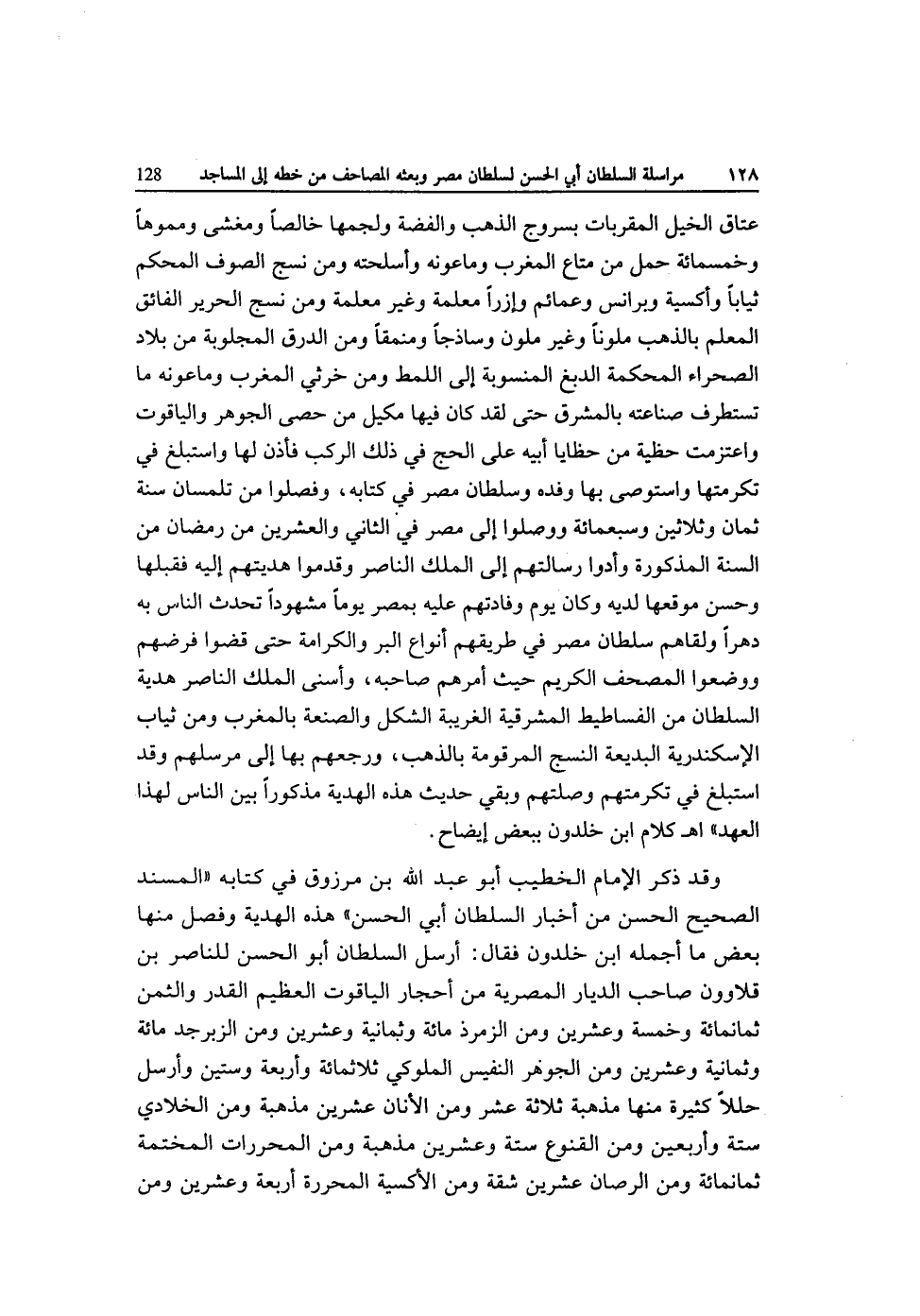 وَقد ذكر الإِمَام الْخَطِيب أَبُو عبد الله بن مَرْزُوق فِي كِتَابه الْمسند الصَّحِيح الْحسن من أَخْبَار السُّلْطَان أبي الْحسن هَذِه الْهَدِيَّة وَفصل مِنْهَا بعض مَا أجمله إِبْنِ خلدون فَقَالَ أرسل السُّلْطَان أَبُو الْحسن للناصر بن قلاوون صَاحب الديار المصرية من أَحْجَار الْيَاقُوت الْعَظِيم الْقدر وَالثمن ثَمَانمِائَة وَخَمْسَة وَعشْرين وَمن الزمرد مائَة وَثَمَانِية وَعشْرين وَمن الزبرجد مائَة وَثَمَانِية وَعشْرين وَمن الْجَوْهَر النفيس الملوكي ثَلَاثمِائَة وَأَرْبَعَة وَسِتِّينَ وَأرْسل حللا كَثِيرَة مِنْهَا مذهبَة ثَلَاثَة عشر وَمن الأنان عشْرين مذهبَة وَمن الخلادي سِتَّة وَأَرْبَعين وَمن القنوع سِتَّة وَعشْرين مذهبَة وَمن المحرارت المختمة ثَمَانمِائَة وَمن الرصان عشْرين شقة وَمن الأكسية المحررة أَرْبَعَة وَعشْرين وَمن